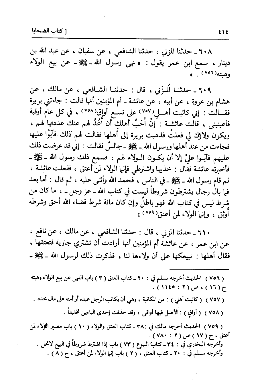 ٦١٠ - عَنْ مَالِكٍ، عَنْ نَافِعٍ، عَنِ ابْنِ عُمَرَ، عَنْ عَائِشَةَ أُمِّ الْمُؤْمِنِينَ، رَضِيَ اللَّهُ عَنْهَا أَنَّهَا أَرَادَتْ أَنْ تَشْتَرِيَ جَارِيَةً فَتُعْتِقَهَا فَقَالَ أَهْلُهَا: نَبِيعُكِهَا عَلَى أَنَّ وَلَاءَهَا لَنَا فَذَكَرَتْ ذَلِكَ لِرَسُولِ اللَّهِ صَلَّى اللهُ عَلَيْهِ وَسَلَّمَ فَقَالَ: «لَا يَمْنَعُكِ ذَلِكَ فَإِنَّمَا الْوَلَاءُ لِمَنْ أَعْتَقَ»