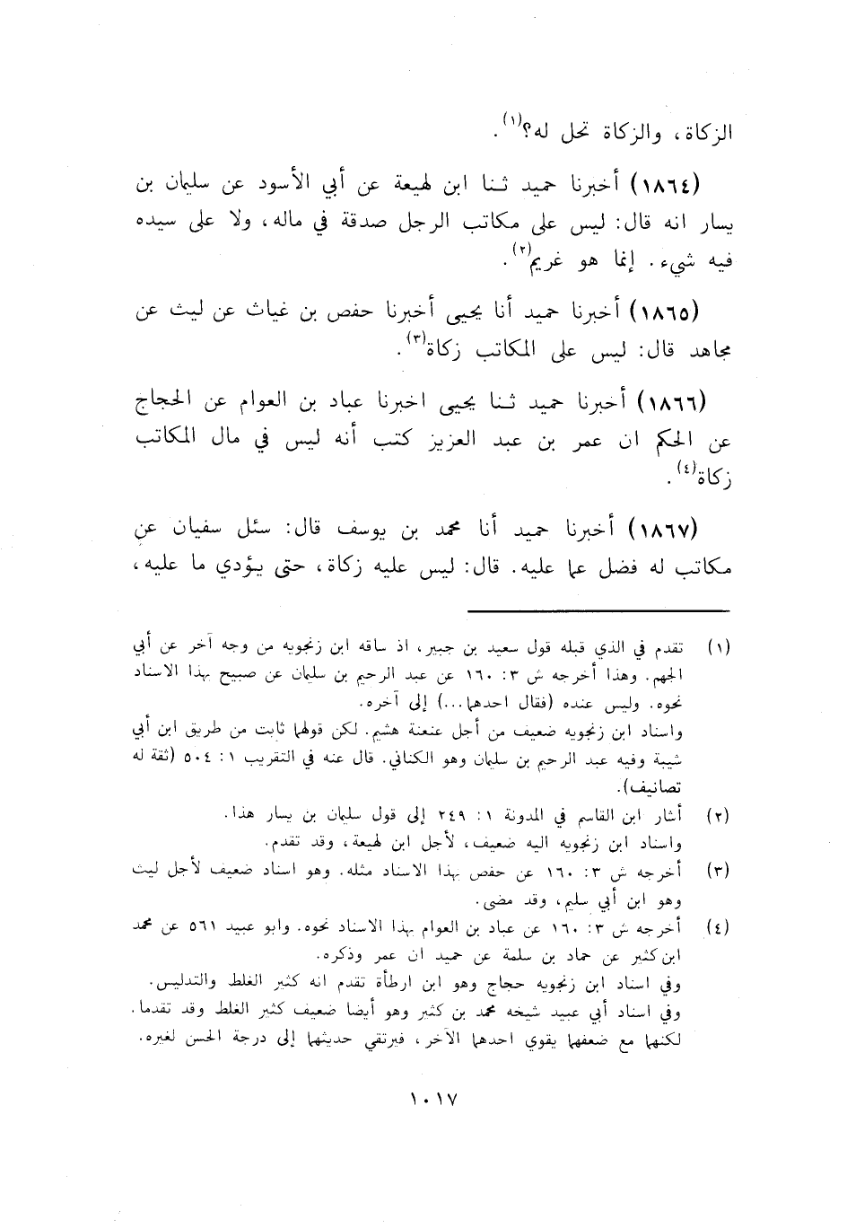 1865 - أَخْبَرَنَا حُمَيْدٌ أنا يَحْيَى، أَخْبَرَنَا حَفْصُ بْنُ غِيَاثٍ، عَنْ لَيْثٍ، عَنْ مُجَاهِدٍ قَالَ: «§لَيْسَ عَلَى الْمُكَاتَبِ زَكَاةٌ»