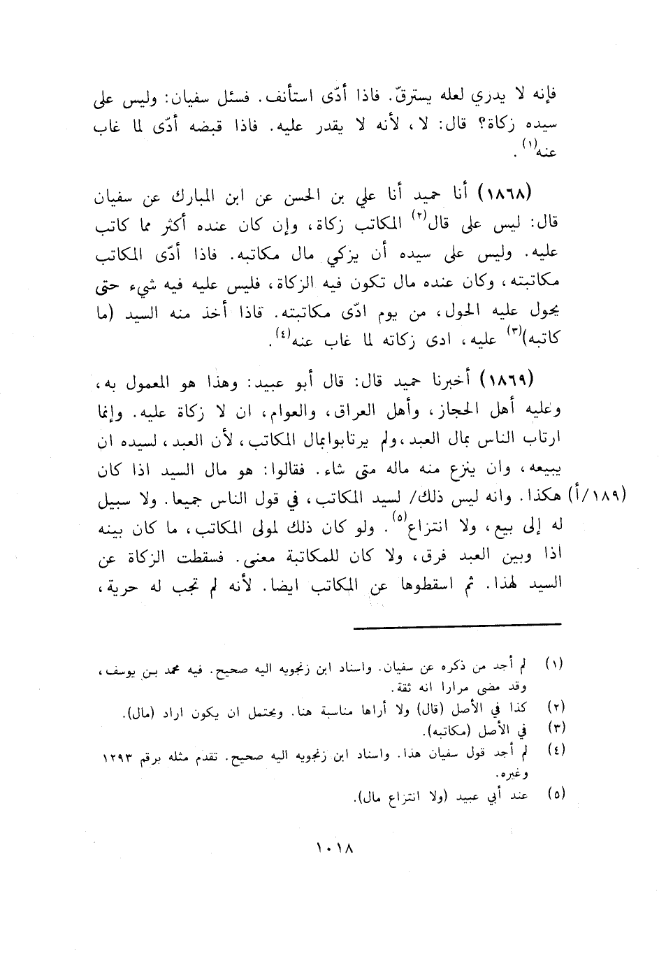 1868 - أَنَا حُمَيْدٌ أنا عَلِيُّ بْنُ الْحَسَنِ، عَنِ ابْنِ الْمُبَارَكِ، عَنْ سُفْيَانَ قَالَ: «§لَيْسَ عَلَى مَالِ الْمُكَاتَبِ زَكَاةٌ، وَإِنْ كَانَ عِنْدَهُ أَكْثَرُ مِمَّا كَاتَبَ عَلَيْهِ، وَلَيْسَ عَلَى سَيِّدِهِ أَنْ يُزَكِّيَ مَالَ مُكَاتَبِهِ، فَإِذَا أَدَّى الْمُكَاتَبُ مُكَاتَبَتَهُ، وَكَانَ عِنْدَهُ مَالٌ تَكُونُ فِيهِ الزَّكَاةُ، فَلَيْسَ عَلَيْهِ فِيهِ شَيْءٌ حَتَّى يَحُولَ عَلَيْهِ الْحَوْلُ، مِنْ يَوْمِ أَدَّى مُكَاتَبَتَهُ، فَإِذَا أَخَذَ مِنْهُ السَّيِّدُ مَا كَاتَبَهُ عَلَيْهِ، أَدَّى زَكَاتَهُ لِمَا غَابَ عَنْهُ» . أَنَا حُمَيْدٌ