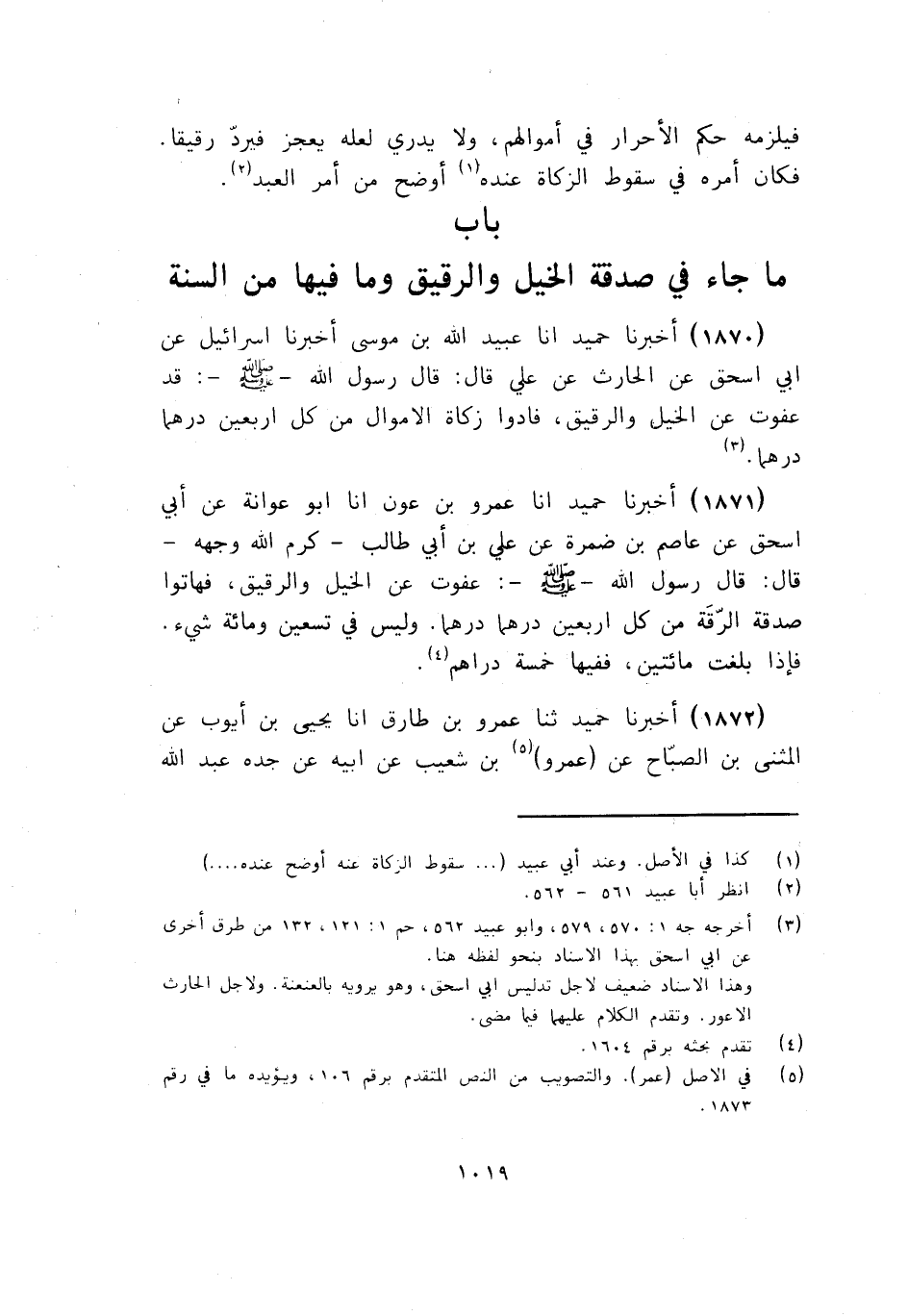 1871 - أَخْبَرَنَا حُمَيْدٌ أنا عَمْرُو بْنُ عَوْنٍ، أنا أَبُو عَوَانَةَ، عَنْ أَبِي إِسْحَاقَ، عَنْ عَاصِمِ بْنِ ضَمْرَةَ، عَنْ عَلِيِّ بْنِ أَبِي طَالِبٍ كَرَّمَ اللَّهُ وَجْهَهُ قَالَ: قَالَ رَسُولُ اللَّهِ صَلَّى اللهُ عَلَيْهِ وَسَلَّمَ: «§عَفَوْتُ عَنِ الْخَيْلِ وَالرَّقِيقِ، فَهَاتُوا صَدَقَةَ الرِّقَةِ مِنْ كُلِّ أَرْبَعِينَ دِرْهَمًا دِرْهَمًا، وَلَيْسَ فِي تِسْعِينَ وَمِائَةٍ شَيْءٌ، فَإِذَا بَلَغَتْ مِائَتَيْنِ فَفِيهَا خَمْسَةُ دَرَاهِمَ»