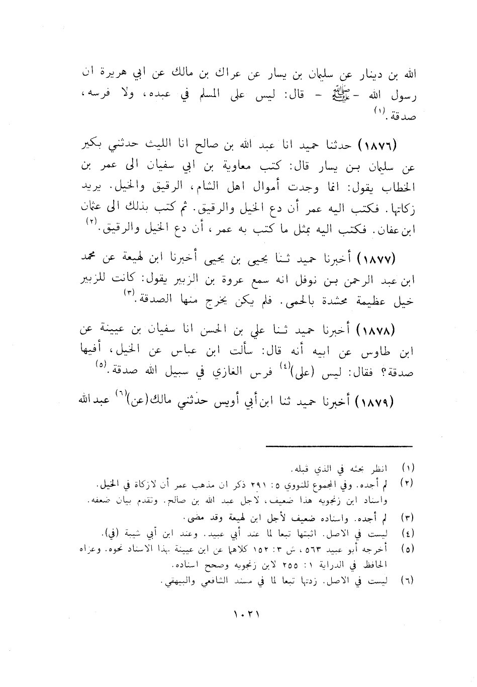 1877 - ثَنَا يَحْيَى بْنُ يَحْيَى، أَخْبَرَنَا ابْنُ لَهِيعَةَ، عَنْ مُحَمَّدِ بْنِ عَبْدِ الرَّحْمَنِ بْنِ نَوْفَلٍ، أَنَّهُ سَمِعَ عُرْوَةَ بْنَ الزُّبَيْرِ يَقُولُ: «كَانَتْ §لِلزُّبَيْرِ خَيْلٌ عَظِيمَةٌ مُحَشَّدَةٌ بِالْحُمَّى، فَلَمْ يَكُنْ يُخْرِجُ مِنْهَا الصَّدَقَةَ»