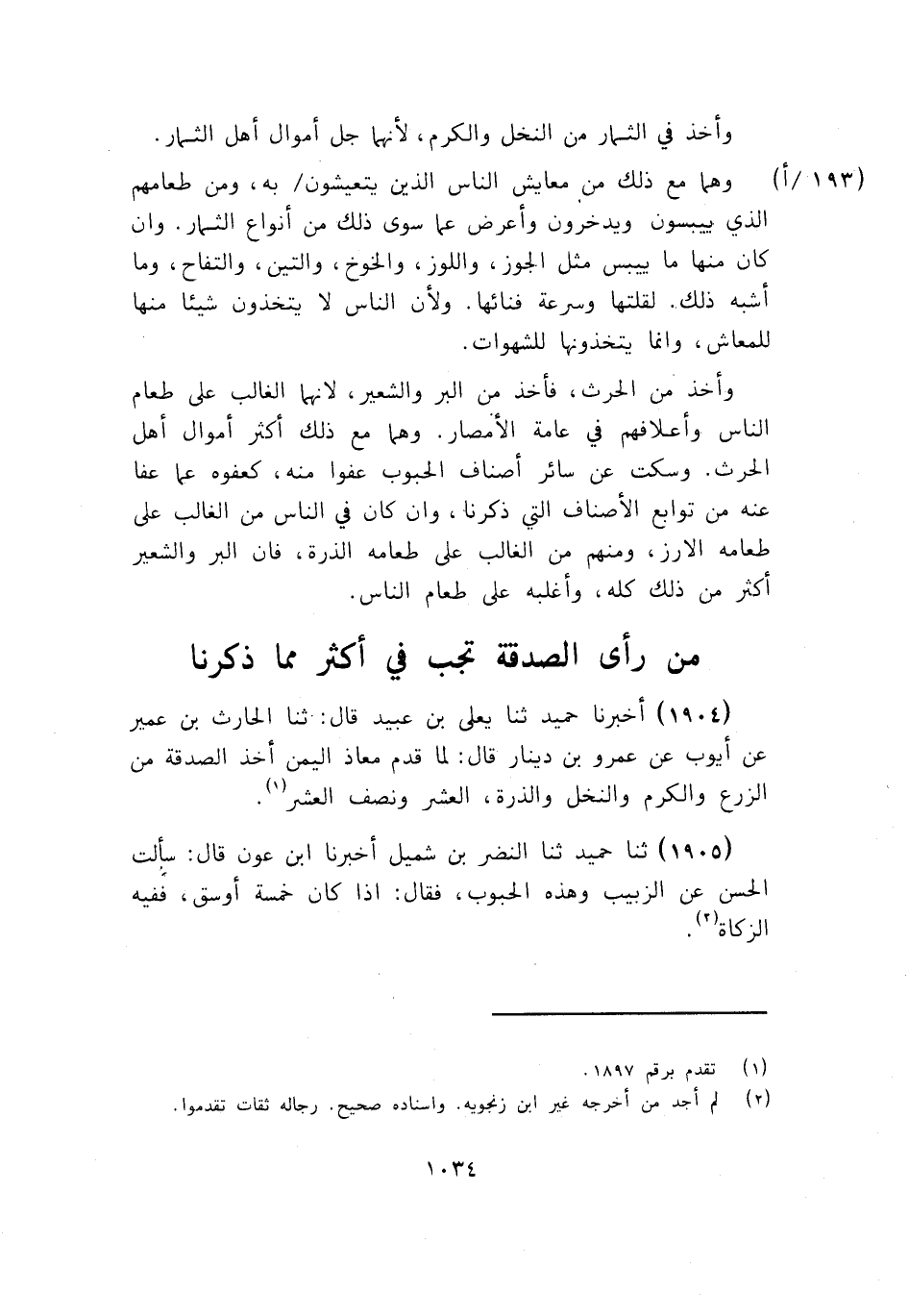 1908 - ثَنَا عَبْدُ اللَّهِ بْنُ صَالِحٍ، حَدَّثَنِي اللَّيْثُ، حَدَّثَنِي يُونُسُ، عَنِ ابْنِ شِهَابٍ قَالَ: بَلَغَنَا «أَنَّ §الصَّدَقَةَ، لَا تَكُونُ إِلَّا فِي النَّخْلِ , وَالْكَرْمِ , وَالشَّعِيرِ، وَالسُّلْتِ , وَالزَّبِيبِ , وَالزَّيْتُونِ , وَالْعَسَلِ، فِي عُشُورِ ذَلِكَ , فَأَمَّا مَا سِوَى ذَلِكَ فَأَرَى أَنْ تُخْرَجَ الصَّدَقَةُ مِنْ أَثْمَانِهِ»