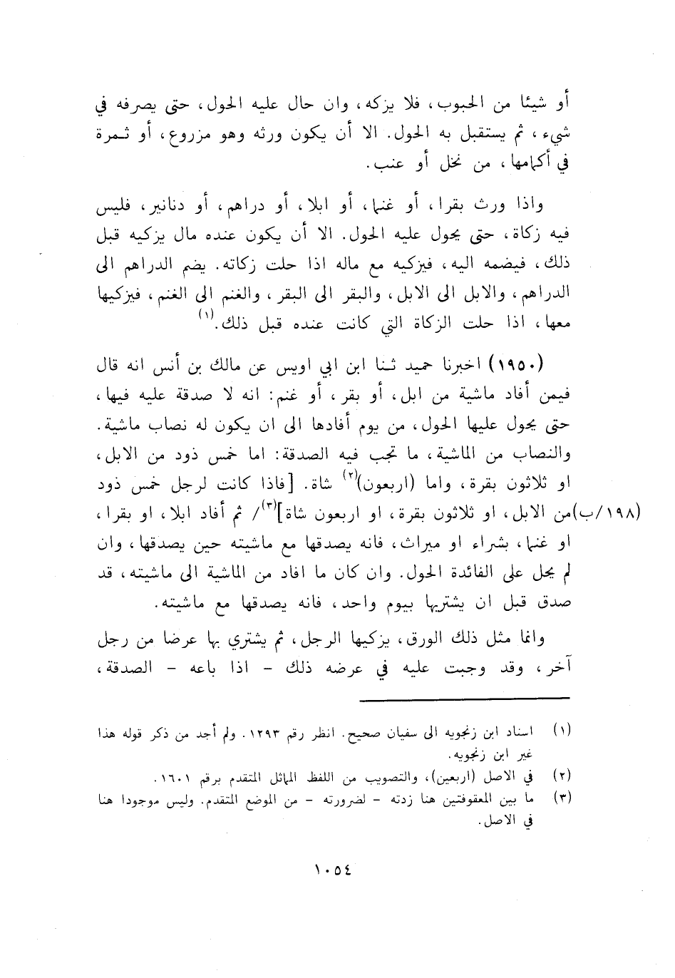 1950 - ثَنَا ابْنُ أَبِي أُوَيْسٍ، عَنْ مَالِكِ بْنِ أَنَسٍ قَالَ: " §فِيمَنْ أَفَادَ مَاشِيَةً مِنْ إِبِلٍ , أَوْ بَقَرٍ، أَوْ غَنَمٍ: إِنَّهُ لَا صَدَقَةَ عَلَيْهِ فِيهَا , حَتَّى يَحُولَ عَلَيْهَا الْحَوْلُ , مِنْ يَوْمِ أَفَادَهَا إِلَى أَنْ يَكُونَ لَهُ نِصَابُ مَاشِيَةٍ , وَالنِّصَابُ مِنَ الْمَاشِيَةِ مَا تَجِبُ فِيهِ الصَّدَقَةُ: إِمَّا خَمْسُ ذَوْدٍ مِنَ الْإِبِلِ , أَوْ ثَلَاثُونَ بَقَرَةً , وَإِمَّا أَرْبَعُونَ شَاةً , فَإِذَا كَانَتْ لِرَجُلٍ خَمْسُ ذَوْدٍ مِنَ الْإِبِلِ , أَوْ ثَلَاثُونَ بَقَرَةً , أَوْ أَرْبَعُونَ شَاةً , ثُمَّ أَفَادَ إِبِلًا , أَوْ بَقَرًا , أَوْ غَنَمًا , بِشِرَاءٍ أَوْ مِيرَاثٍ , فَإِنَّهُ يُصَدِّقُهَا مَع مَاشِيَتِهِ حِينَ يُصَدِّقُهَا , وَإِنْ لَمْ يَحُلْ عَلَى الْفَائِدَةِ الْحَوْلُ , وَإِنْ كَانَ مَا أَفَادَ مِنَ الْمَاشِيَةِ إِلَى مَاشِيَتِهِ قَدْ صُدِّقَ قَبْلَ أَنْ يَشْتَرِيَهَا بِيَوْمٍ وَاحِدٍ , فَإِنَّهُ يُصَدِّقُهَا مَعَ مَاشِيَتِهِ وَإِنَّمَا مِثْلُ ذَلِكَ الْوَرِقُ , يُزَكِّيهَا الرَّجُلُ ثُمَّ يَشْتَرِي بِهَا عَرْضًا مِنْ رَجُلٍ آخَرَ , وَقَدْ وَجَبَتْ عَلَيْهِ فِي عَرْضِهِ ذَلِكَ إِذَا بَاعَهُ الصَّدَقَةُ , -[1055]- فَيُخْرِجُ الرَّجُلُ الْآخَرُ صَدَقَتَهَا , فَيَكُونُ الْأَوَّلُ قَدْ صَدَّقَهَا هَذَا الْيَوْمَ , وَيَكُونُ الْآخَرُ قَدْ صَدَّقَهَا مِنَ الْغَدِ وَقَالَ مَالِكٌ فِي رَجُلٍ كَانَتْ لَهُ غَنَمٌ لَا تَجِبُ فِيهَا الصَّدَقَةُ , فَاشْتَرَى إِلَيْهَا غَنَمًا كَثِيرَةً , أَوْ وَرِثَهَا: إِنَّهُ لَا تَجِبُ عَلَيْهِ فِي الْغَنَمِ كُلِّهَا صَدَقَةٌ , حَتَّى يَحُولَ عَلَيْهَا الْحَوْلُ مِنْ يَوْمِ أَفَادَهَا بِشِرَاءٍ أَوْ مِيرَاثٍ وَقَالَ مَالِكٌ فِي رَجُلٍ هَلَكَ , وَخَلَفَ زَرْعًا قَدْ يَبِسَ: إِنَّ الزَّكَاةَ عَلَيْهِ , إِنْ كَانَ فِيهِ خَمْسَةُ أَوْسُقٍ , فَإِنْ كَانَ يَوْمَ مَاتَ صَاحِبُهُ أَخْضَرَ , وَوَرِثَهُ نَفَرٌ فَفَرَّقُوهُ , فَإِنَّمَا تَقَعُ الزَّكَاةُ عَلَيْهِمْ , إِذَا كَانَ حِصَّةُ كُلِّ إِنْسَانٍ مِنْهُمْ خَمْسَةَ أَوْسُقٍ , وَإِلَّا فَلَا