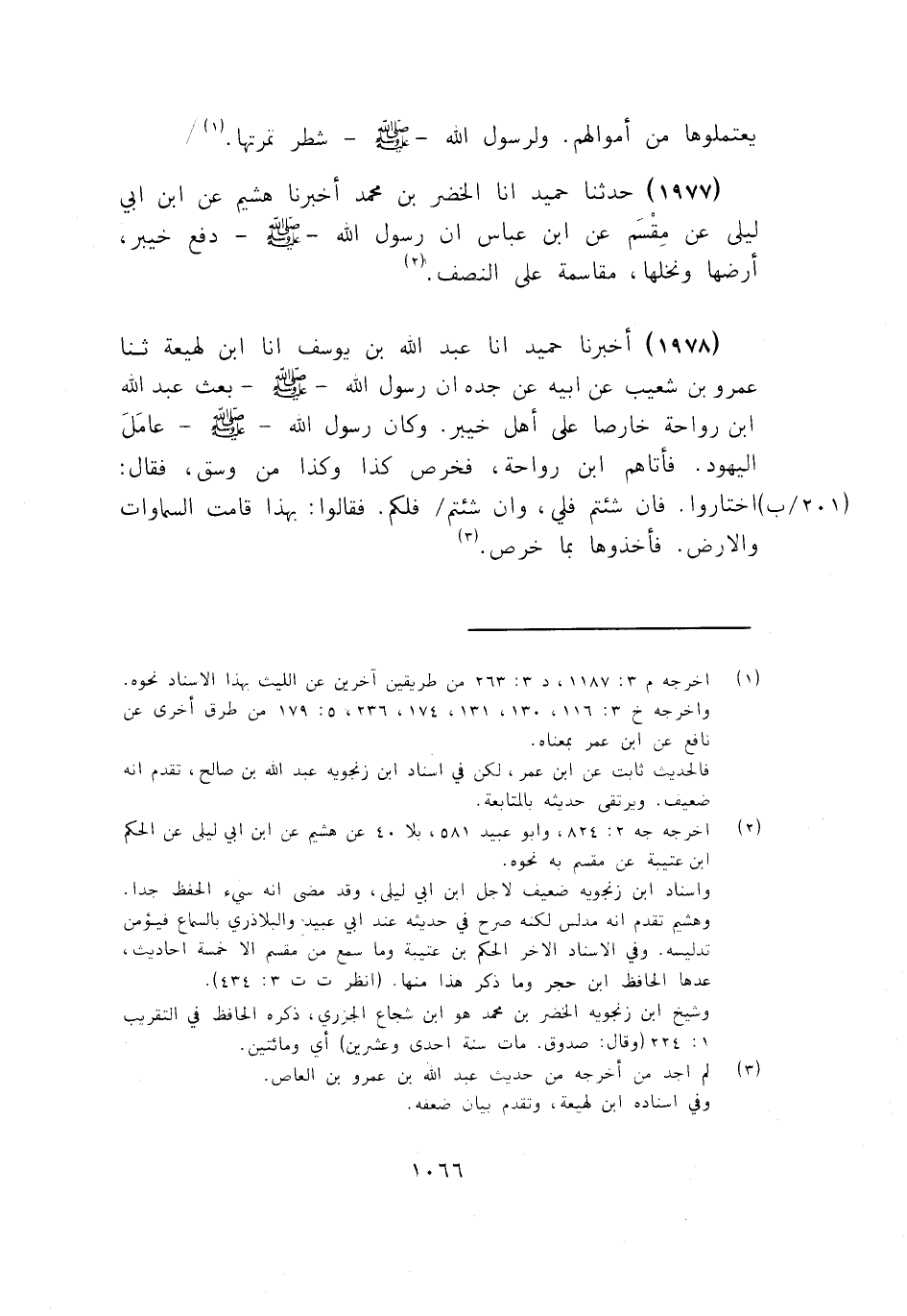1977 - أَخْبَرَنَا حُمَيْدٌ أنا الْخَضِرُ بْنُ مُحَمَّدٍ، أَخْبَرَنَا هُشَيْمٌ، عَنِ ابْنِ أَبِي لَيْلَى، عَنْ مِقْسَمٍ، عَنِ ابْنِ عَبَّاسٍ، أَنَّ رَسُولَ اللَّهِ صَلَّى اللهُ عَلَيْهِ وَسَلَّمَ: «§دَفَعَ خَيْبَرَ أَرْضِهَا وَنَخْلَهَا مُقَاسَمَةً عَلَى النِّصْفِ»