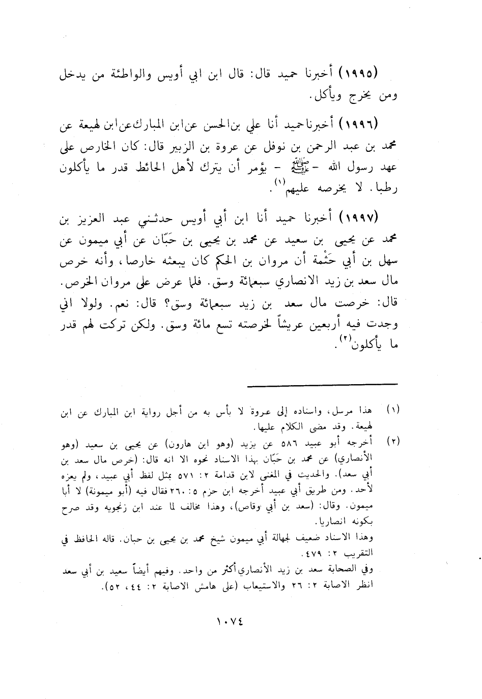 1996 - أَخْبَرَنَا حُمَيْدٌ أنا عَلِيُّ بْنُ الْحَسَنِ، عَنِ ابْنِ الْمُبَارَكِ، عَنِ ابْنِ لَهِيعَةَ، عَنْ مُحَمَّدِ بْنِ عَبْدِ الرَّحْمَنِ بْنِ نَوْفَلٍ، عَنْ عُرْوَةَ بْنِ الزُّبَيْرِ قَالَ: «كَانَ §الْخَارِصُ عَلَى عَهْدِ رَسُولِ اللَّهِ يُؤْمَرُ أَنْ يَتْرُكَ لِأَهْلِ الْحَائِطِ قَدْرَ مَا يَأْكُلُونَ رُطَبًا , لَا يَخْرُصُهُ عَلَيْهِمْ»