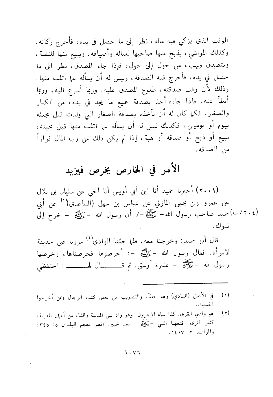 2001 - أَخْبَرَنَا حُمَيْدٌ أنا ابْنُ أَبِي أُوَيْسٍ، أنا أَخِي، عَنْ سُلَيْمَانَ بْنِ بِلَالٍ، عَنْ عَمْرِو بْنِ يَحْيَى الْمَازِنِيِّ، عَنْ عَبَّاسِ بْنِ سَهْلٍ السَّاعِدِيِّ، عَنْ أَبِي حُمَيْدٍ صَاحِبِ رَسُولِ اللَّهِ صَلَّى اللهُ عَلَيْهِ وَسَلَّمَ، أَنَّ رَسُولَ اللَّهِ صَلَّى اللهُ عَلَيْهِ وَسَلَّمَ خَرَجَ إِلَى تَبُوكَ قَالَ أَبُو حُمَيْدٍ: وَخَرَجْنَا مَعَهُ , فَلَمَّا جِئْنَا الْوَادِيَ مَرَرْنَا عَلَى حَدِيقَةٍ لِامْرَأَةٍ , فَقَالَ رَسُولُ اللَّهِ صَلَّى اللهُ عَلَيْهِ وَسَلَّمَ: " §اخْرُصُوهَا , فَخَرَصْنَاهَا وَخَرَصَهَا رَسُولُ اللَّهِ صَلَّى اللهُ عَلَيْهِ وَسَلَّمَ عَشَرَةَ أَوْسُقٍ , ثُمَّ قَالَ لَهَا: احْتَفِظِي -[1077]- بِمَا يَخْرُجُ مِنْهَا حَتَّى نَرْجِعَ إِلَيْكِ " , فَلَمَّا رَجَعْنَا مَرَرْنَا عَلَى الْمَرْأَةَ، فَسَأَلَهَا رَسُولُ اللَّهِ صَلَّى اللهُ عَلَيْهِ وَسَلَّمَ عَمَّا خَرَجَ مِنْ حَدِيقَتِهَا، فَقَالَتْ: خَرَجَ مِنْهَا عَشَرَةُ أَوْسُقٍ