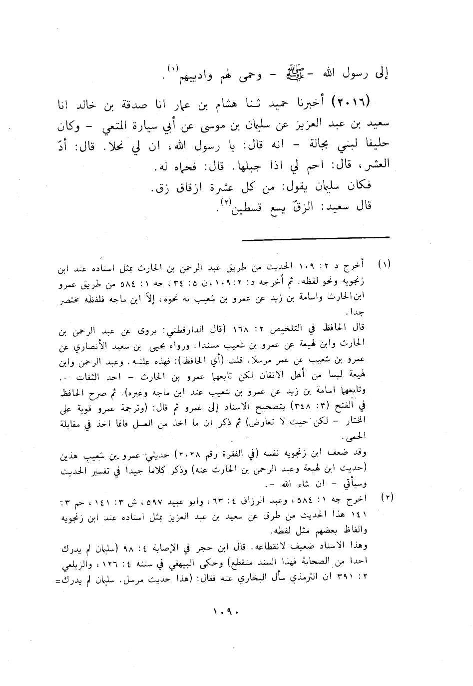 2016 - ثَنَا هِشَامُ بْنُ عَمَّارٍ، أنا صَدَقَةُ بْنُ خَالِدٍ، أنا سَعِيدُ بْنُ عَبْدِ الْعَزِيزِ، عَنْ سُلَيْمَانَ بْنِ مُوسَى، عَنْ أَبِي سَيَّارَةَ الْمُتُعِيِّ، وَكَانَ حَلِيفًا لِبَنِي بَجَالَةَ , أَنَّهُ قَالَ: يَا رَسُولَ اللَّهِ , إِنَّ لِي نَحْلًا , قَالَ: «§أَدِّ الْعُشْرَ» , قَالَ: احْمِ لِي إِذًا جَبَلَهَا , قَالَ: فَحَمَاهُ لَهُ فَكَانَ سُلَيْمَانُ يَقُولُ: مِنْ كُلِّ عَشَرَةِ أَزْقَاقٍ زِقٌّ قَالَ سَعِيدٌ: الزِّقُّ يَسَعُ قِسْطَيْنِ