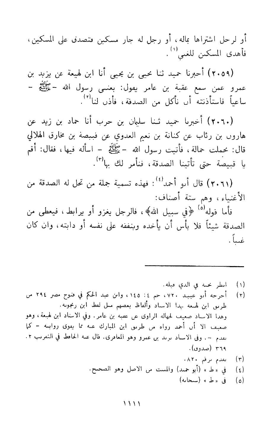 2061 - قَالَ أَبُو أَحْمَدَ: فَهَذِهِ تَسْمِيَةُ جُمْلَةِ مَنْ تَحِلُّ لَهُ الصَّدَقَةُ مِنَ الْأَغْنِيَاءِ وَهُمْ سِتَّةُ أَصْنَافٍ: فَأَمَّا قَوْلُهُ: {فِي سَبِيلِ اللَّهِ} [التوبة: 60] ، فَالرَّجُلُ يَغْزُو أَوْ يُرَابِطُ , فَيُعْطَى مِنَ الصَّدَقَةِ شَيْئًا، فَلَا بَأْسَ أَنْ يَأْخُذَهُ وَيُنْفِقَهُ عَلَى نَفْسِهِ أَوْ دَابَّتِهِ، وَإِنْ كَانَ غَنِيًّا -[1112]- وَأَمَّا ابْنُ السَّبِيلِ: فَالْغَنِيُّ يُسَافِرُ فَيُصَابُ فِي مَالِهِ وَيَنْفَدُ مَا مَعَهُ , فَيُعْطَى مِنَ الصَّدَقَةِ مَا يَتَبَلَّغُ بِهِ , وَلَا يَكُونُ دَيْنًا عَلَيْهِ وَأَمَّا قَوْلُهُ: {وَالْعَامِلِينَ عَلَيْهَا} [التوبة: 60] ، فَهُمُ الَّذِينَ يَسْعَوْنَ عَلَى الصَّدَقَاتِ حَتَّى يَجْمَعُوهَا , فَيُعْطَوْنَ مِنْهَا بِقَدْرِ عُمَالَتِهُمْ , وَإِنْ كَانُوا أَغْنِيَاءَ وَقَوْلُهُ: {وَالْغَارِمِينَ} [التوبة: 60] ، فَالرَّجُلُ يُصَابُ فِي غَلَّةِ ضَيْعَتِهِ , أَوْ فِي مَاشِيَتِهِ، أَوْ فِي تِجَارَتِهِ فَيَدَّانُ عَلَى عِيَالِهِ فَيُعْطَى مِنَ الصَّدَقَةِ مَا يَقْضِي بِهِ دَيْنَهُ , وَإِنْ كَانَ غَنِيًّا وَذَلِكَ لِأَنَّ اللَّهَ جَلَّ ثَنَاؤُهُ قَالَ فِي آيَةِ الصَّدَقَاتِ: {وَالْعَامِلِينَ عَلَيْهَا} [التوبة: 60] {وَالْغَارِمِينَ وَفِي سَبِيلِ اللَّهِ وَابْنِ السَّبِيلِ} [التوبة: 60] ، فَلَزِمَتْ هَذِهِ الْأَشْيَاءُ مِنْ فُقَرَائِهِمْ وَأَغْنِيَائِهِمْ , ثُمَّ فَسَّرَهُمْ رَسُولُ اللَّهِ صَلَّى اللهُ عَلَيْهِ وَسَلَّمَ أَيْضًا وَأَمَّا قَوْلُهُ صَلَّى اللهُ عَلَيْهِ وَسَلَّمَ: «وَرَجُلٌ اشْتَرَاهَا بِمَالِهِ» , فَالرَّجُلُ يَشْتَرِي الصَّدَقَةَ مِنَ السَّاعِي عَلَيْهَا بَعْدَمَا يَقْبِضُهَا مِنْ أَهْلِهَا , وَمِنَ الَّذِي يَقْسِمُ فِيهِمْ , أَوْ مِنَ السُّؤَّالِ الَّذِينَ يَسْأَلُونَ النَّاسَ , فَلَا بَأْسَ عَلَيْهِ فِي ذَلِكَ , لِأَنَّ الصَّدَقَةَ قَدْ بَلَغَتْ مَحِلَّهَا , وَتَحَوَّلَتْ بَيْعًا بَعْدَمَا كَانَتْ صَدَقَةً وَأَمَّا قَوْلُهُ: «وَرَجُلٌ لَهُ جَارٌ مِسْكِينٌ» ، فَمِسْكِينٌ يُتَصَدَّقُ عَلَيْهِ بِصَدَقَةٍ فَأَهْدَاهَا لِغَنِيٍّ , أَوْ دَعَاهُ إِلَيْهَا , فَلَا بَأْسَ أَنْ يَقْبَلَهَا مِنْهُ , أَوْ يُجِيبَ دَعْوَتَهُ إِلَيْهَا , لِأَنَّهَا قَدْ عَادَتْ هَدِيَّةً أَوْ دَعْوَةً , بَعْدَمَا كَانَتْ صَدَقَةً