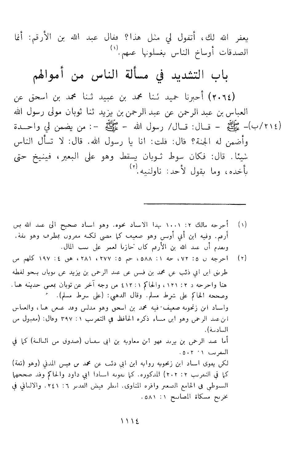 2064 - ثَنَا مُحَمَّدُ بْنُ عُبَيْدٍ , ثَنَا مُحَمَّدُ بْنُ إِسْحَاقَ، عَنِ الْعَبَّاسِ بْنِ عَبْدِ الرَّحْمَنِ، عَنْ عَبْدِ الرَّحْمَنِ بْنِ يَزِيدَ، ثَنَا ثَوْبَانُ مَوْلَى رَسُولِ اللَّهِ صَلَّى اللهُ عَلَيْهِ وَسَلَّمَ قَالَ: قَالَ رَسُولُ اللَّهِ صَلَّى اللهُ عَلَيْهِ وَسَلَّمَ: «§مَنْ يَضْمَنُ لِي وَاحِدَةً وَأَضْمَنُ لَهُ الْجَنَّةَ؟» قُلْتُ: أَنَا يَا رَسُولَ اللَّهِ، قَالَ: «لَا تَسْأَلِ النَّاسَ شَيْئًا» , قَالَ: فَكَانَ سَوْطُ ثَوْبَانَ يَسْقُطُ وَهُوَ عَلَى الْبَعِيرِ , فَيُنِيخُ حَتَّى يَأْخُذَهُ , وَمَا يَقُولُ لِأَحَدٍ: نَاوِلْنِيهِ
