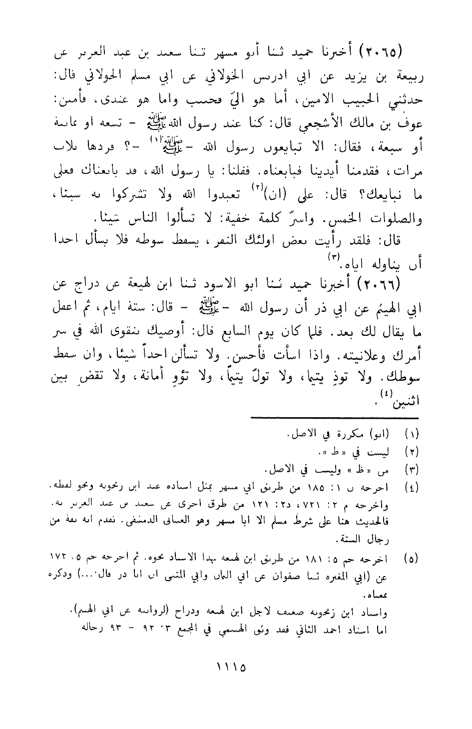 2065 - ثَنَا أَبُو مُسْهِرٍ، ثَنَا سَعِيدُ بْنُ عَبْدِ الْعَزِيزِ، عَنْ رَبِيعَةَ بْنِ يَزِيدَ، عَنْ أَبِي إِدْرِيسَ الْخَوْلَانِيِّ، عَنْ أَبِي مُسْلِمٍ الْخَوْلَانِيِّ قَالَ: حَدَّثَنِي الْحَبِيبُ الْأَمِينُ، أَمَّا هُوَ إِلَيَّ فَحَبِيبٌ، وَأَمَّا هُوَ عِنْدِي فَأَمِينٌ: عَوْفُ بْنُ مَالِكٍ الْأَشْجَعِيُّ قَالَ: كُنَّا عِنْدَ رَسُولِ اللَّهِ صَلَّى اللهُ عَلَيْهِ وَسَلَّمَ تِسْعَةً أَوْ ثَمَانِيَةً أَوْ سَبْعَةً فَقَالَ: «§أَلَا تُبَايعُونَ رَسُولَ اللَّهِ صَلَّى اللهُ عَلَيْهِ وَسَلَّمَ؟» فَرَدَّدَهَا ثَلَاثَ مَرَّاتٍ , فَقَدَّمْنَا أَيْدِيَنَا فَبَايَعْنَاهُ , فَقُلْنَا: يَا رَسُولَ اللَّهِ , قَدْ بَايَعْنَاكَ فَعَلَامَ نُبَايعُكَ؟ قَالَ: «عَلَى أَنْ تَعْبُدُوا اللَّهَ وَلَا تُشْرِكُوا بِهِ شَيْئًا , وَالصَّلَوَاتِ الْخَمْسِ» , وَأَسَرَّ كَلِمَةً خَفِيَّةً: «لَا تَسْأَلُوا النَّاسَ شَيْئًا» ، قَالَ: فَلَقَدْ رَأَيْتُ بَعْضَ أُولَئِكَ النَّفْرِ يَسْقُطُ سَوْطُهُ فَلَا يَسْأَلُ أَحَدًا أَنْ يُنَاوِلَهُ إِيَّاهُ