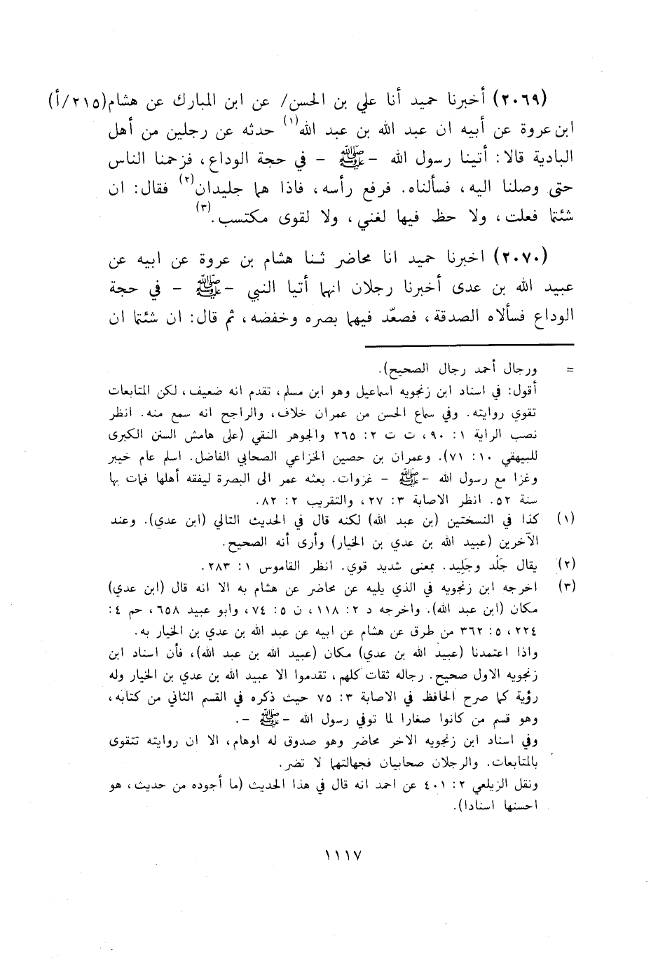 2069 - أَخْبَرَنَا حُمَيْدٌ أنا عَلِيُّ بْنُ الْحَسَنِ، عَنِ ابْنِ الْمُبَارَكِ، عَنْ هِشَامِ بْنِ عُرْوَةَ، عَنْ أَبِيهِ، أَنَّ عَبْدَ اللَّهِ بْنَ عَبْدِ اللَّهِ، حَدَّثَهُ، عَنْ رَجُلَيْنِ مِنْ أَهْلِ الْبَادِيَةِ قَالَا: أَتَيْنَا رَسُولَ اللَّهِ صَلَّى اللهُ عَلَيْهِ وَسَلَّمَ فِي حَجَّةِ الْوَدَاعِ , فَزَحَمْنَا النَّاسَ حَتَّى وَصَلْنَا إِلَيْهِ , فَسَأَلْنَاهُ , فَرَفَعَ رَأْسَهُ , فَإِذَا هُمَا جَلِيدَانِ، فَقَالَ: «§إِنْ شِئْتُمَا فَعَلْتُ , وَلَا حَظَّ فِيهَا لِغَنِيٍّ وَلَا لِقَوِيٍّ مُكْتَسِبٍ»