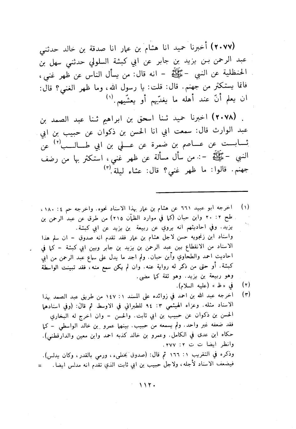 2077 - أَخْبَرَنَا حُمَيْدٌ أنا هِشَامُ بْنُ عَمَّارٍ، أنا صَدَقَةُ بْنُ خَالِدٍ، حَدَّثَنِي عَبْدُ الرَّحْمَنِ بْنُ يَزِيدَ بْنِ جَابِرٍ، عَنْ أَبِي كَبْشَةَ السَّلُولِيِّ، حَدَّثَنِي سَهْلُ بْنُ الْحَنْظَلِيَّةِ، عَنِ النَّبِيِّ صَلَّى اللهُ عَلَيْهِ وَسَلَّمَ أَنَّهُ قَالَ: «§مَنْ يَسْأَلِ النَّاسَ عَنْ ظَهْرِ غِنًى , فَإِنَّمَا يَسْتَكْثِرُ مِنْ جَهَنَّمَ» قَالَ: قُلْتُ: يَا رَسُولَ اللَّهِ , وَمَا ظَهْرُ الْغِنَى؟ قَالَ: «أَنْ يَعْلَمَ أَنَّ عِنْدَ أَهْلِهِ مَا يُغَدِّيهِمْ أَوْ يُعَشِّيهِمْ»
