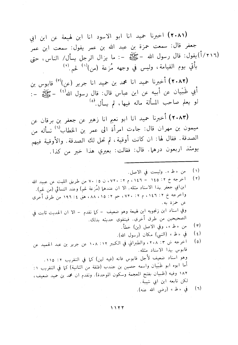 2081 - أَخْبَرَنَا حُمَيْدٌ أنا أَبُو الْأَسْوَدِ، أنا ابْنُ لَهِيعَةَ، عَنِ ابْنِ أَبِي جَعْفَرٍ قَالَ: سَمِعْتُ حَمْزَةَ بْنَ عَبْدِ اللَّهِ بْنِ عُمَرَ يَقُولُ: سَمِعْتُ ابْنَ عُمَرَ، يَقُولُ: قَالَ رَسُولُ اللَّهِ صَلَّى اللهُ عَلَيْهِ وَسَلَّمَ: «§مَا يَزَالُ الرَّجُلُ يَسْأَلُ النَّاسَ حَتَّى يَأْتِيَ يَوْمَ الْقِيَامَةِ وَلَيْسَ فِي وَجْهِهِ مُزْعَةٌ مِنْ لَحْمٍ»