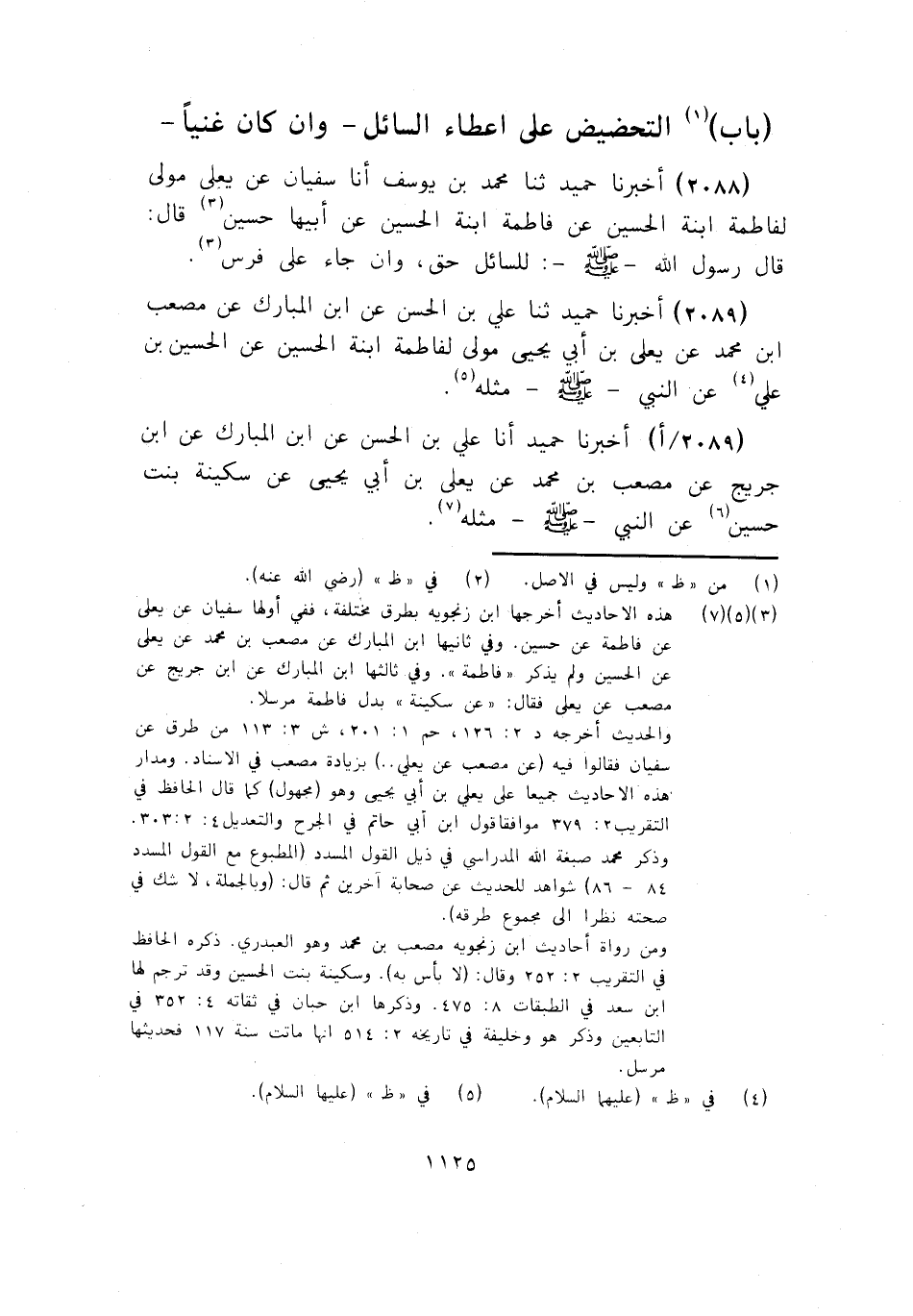 2088 - ثَنَا مُحَمَّدُ بْنُ يُوسُفَ، أنا سُفْيَانُ، عَنْ يَعْلَى، مَوْلًى لِفَاطِمَةَ ابْنَةِ الْحُسَيْنِ، عَنْ فَاطِمَةَ ابْنَةِ الْحُسَيْنِ، عَنْ أَبِيهَا حُسَيْنٍ قَالَ: قَالَ رَسُولُ اللَّهِ صَلَّى اللهُ عَلَيْهِ وَسَلَّمَ: «§لِلسَّائِلِ حَقٌّ وَإِنْ جَاءَ عَلَى فَرَسٍ» . أَخْبَرَنَا حُمَيْدٌ