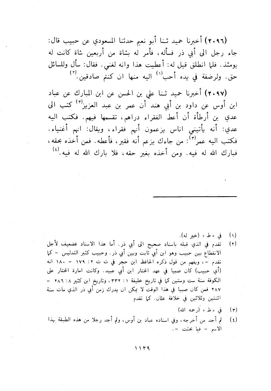 2097 - ثَنَا عَلِيُّ بْنُ الْحَسَنِ، عَنِ ابْنِ الْمُبَارَكِ، عَنْ عَبَّادِ بْنِ أَوْسٍ، عَنْ دَاوُدَ بْنِ أَبِي هِنْدٍ، أَنَّ عُمَرَ بْنَ عَبْدِ الْعَزِيزِ كَتَبَ إِلَى عَدِيِّ بْنِ أَرْطَأَةَ، " أَنِ أَعْطِ الْفُقَرَاءَ، دَرَاهِمَ , تَقْسِمُهَا فِيهِمْ , فَكَتَبَ إِلَيْهِ عَدِيُّ: إِنَّهُ يَأْتِينِي أُنَاسٌ يَزْعُمُونَ أَنَّهُمْ فُقَرَاءُ , وَيُقَالُ: إِنَّهُمْ أَغْنِيَاءُ فَكَتَبَ إِلَيْهِ عُمَرُ: «§مَنْ جَاءَكَ يَزْعُمُ أَنَّهُ فَقِيرٌ فَأَعْطِهِ، فَمَنْ أَخَذَهُ بِحَقِّهِ فَبَارَكَ اللَّهُ لَهُ فِيهِ , وَمَنْ أَخَذَهُ بِغَيْرِ حَقِّهِ فَلَا بَارَكَ اللَّهُ لَهُ فِيهِ»