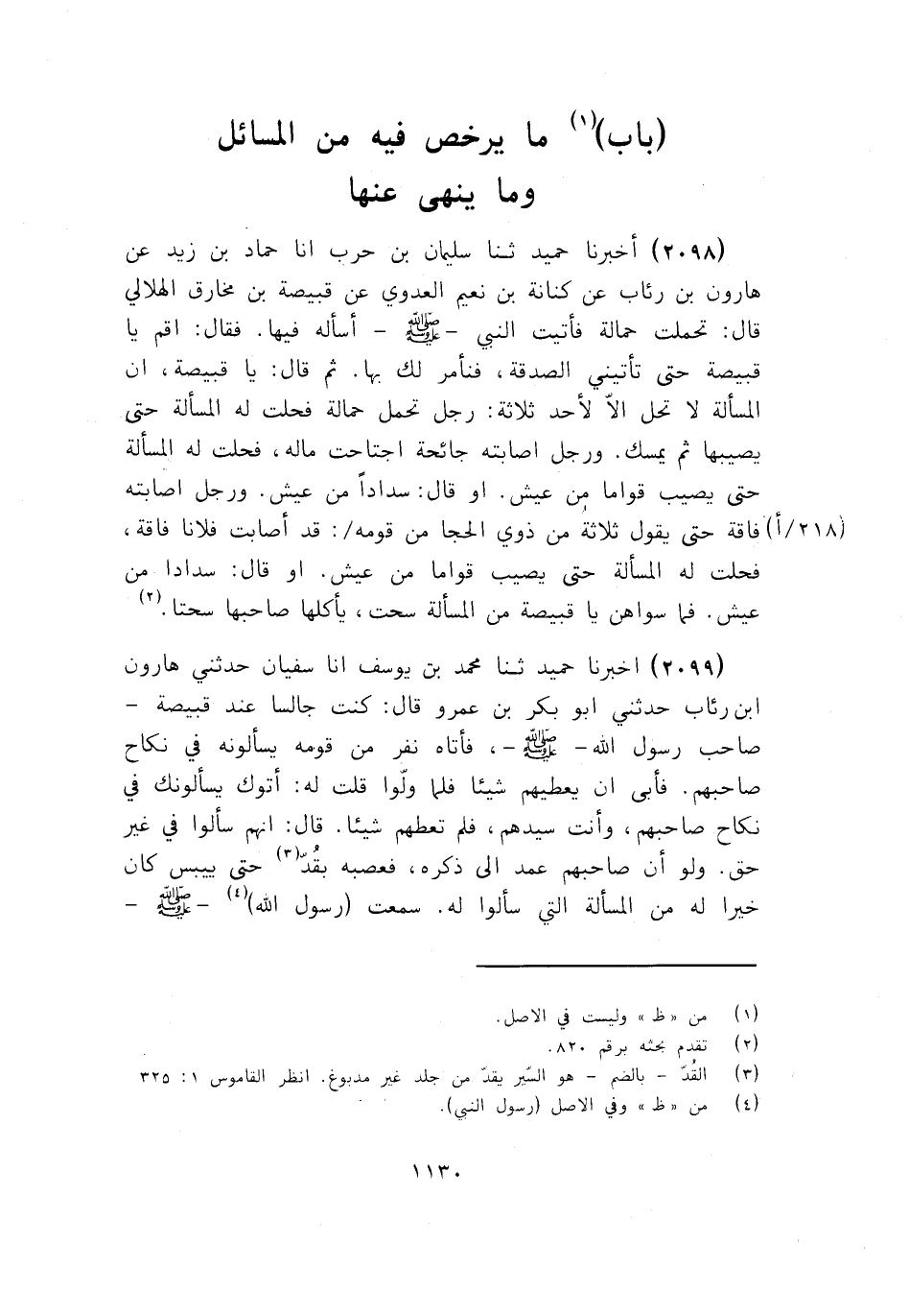 2099 - ثَنَا مُحَمَّدُ بْنُ يُوسُفَ، أنا سُفْيَانُ، حَدَّثَنِي هَارُونُ بْنُ رِئَابٍ، حَدَّثَنِي أَبُو بَكْرِ بْنُ عَمْرٍو قَالَ: كُنْتُ جَالِسًا عِنْدَ قَبِيصَةَ صَاحِبِ رَسُولِ اللَّهِ صَلَّى اللهُ عَلَيْهِ وَسَلَّمَ، فَأَتَاهُ نَفَرٌ مِنْ قَوْمِهِ يَسْأَلُونَهُ فِي نِكَاحِ صَاحِبِهِمْ فَأَبَى أَنْ يُعْطِيَهُمْ شَيْئًا، فَلَمَّا وَلَّوْا قُلْتُ لَهُ: أَتَوْكَ يَسْأَلُونَكَ فِي نِكَاحِ صَاحِبِهِمْ , وَأَنْتَ سَيِّدُهُمْ , فَلَمْ تُعْطِهِمْ شَيْئًا , قَالَ: إِنَّهُمْ سَأَلُوا فِي غَيْرِ حَقٍّ , وَلَوْ أَنَّ صَاحِبَهُمْ عَمَدَ إِلَى ذَكَرِهِ فَعَصَبَهُ بِقُدٍّ حَتَّى يَيْبَسَ كَانَ خَيْرًا لَهُ مِنَ الْمَسْأَلَةِ الَّتِي سَأَلُوا لَهُ , سَمِعْتُ رَسُولَ اللَّهِ صَلَّى اللهُ عَلَيْهِ وَسَلَّمَ -[1131]- يَقُولُ: " §لَا تَحِلُّ الْمَسْأَلَةُ إِلَّا لِثَلَاثَةٍ: رَجُلٍ أَصَابَتْ مَالَهُ حَالِقَةٌ , فَيَسْأَلُ حَتَّى يُصِيبَ سِدَادًا مِنْ عَيْشٍ , ثُمَّ يُمْسِكُ عَنِ الْمَسْأَلَةِ , وَرَجُلٍ تَحَمَّلَ عَنْ قَوْمٍ بِحَمَالَةٍ , فَيَسْأَلُ حَتَّى يُؤَدِّيَ حَمَالَتَهُ، ثُمَّ يُمْسِكُ عَنِ الْمَسْأَلَةِ , وَرَجُلٍ يُقْسِمُ ثَلَاثَةٌ مِنْ ذَوِي الْحِجَا مِنْ قَوْمِهِ بِاللَّهِ: لَقَدْ حَلَّتْ لِفُلَانٍ الْمَسْأَلَةُ، فَيَسْأَلُ حَتَّى يُصِيبَ قِوَامًا مِنْ مَعِيشَةٍ , ثُمَّ يُمْسِكُ عَنِ الْمَسْأَلَةِ، فَمَا سِوَى ذَلِكَ فَهُوَ سُحْتٌ , لَا يَأْكُلُ إِلَّا سُحْتًا "