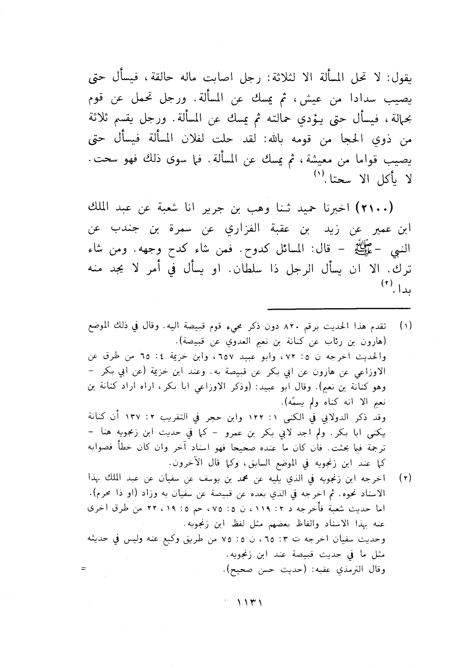2100 - ثَنَا وَهْبُ بْنُ جَرِيرٍ، أنا شُعْبَةُ، عَنْ عَبْدِ الْمَلِكِ بْنِ عُمَيْرٍ، عَنْ زَيْدِ بْنِ عُقْبَةَ الْفَزَارِيِّ، عَنْ سَمُرَةَ بْنِ جُنْدُبٍ، عَنِ النَّبِيِّ صَلَّى اللهُ عَلَيْهِ وَسَلَّمَ قَالَ: «§الْمَسَائِلُ كَدُوحٌ، فَمَنْ شَاءَ كَدَحَ وَجْهَهُ , وَمَنْ شَاءَ تَرَكَ , إِلَّا أَنْ يَسْأَلَ الرَّجُلُ ذَا سُلْطَانٍ , أَوْ يَسْأَلَ فِي أَمْرٍ لَا يَجِدُ مِنْهُ بُدًّا»