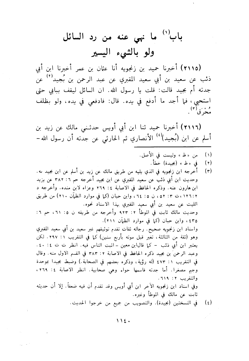 2116 - ثَنَا ابْنُ أَبِي أُوَيْسٍ، حَدَّثَنِي مَالِكٌ، عَنْ زَيْدِ بْنِ أَسْلَمَ، عَنِ ابْنِ بُجَيْدٍ الْأَنْصَارِيِّ ثُمَّ الْحَارِثِيِّ، عَنْ جَدَّتِهِ، أَنَّ رَسُولَ اللَّهِ صَلَّى اللهُ عَلَيْهِ وَسَلَّمَ -[1141]- قَالَ: «§رُدُّوا السَّائِلَ وَلَوْ بِظِلْفٍ مُحْرَقٍ»