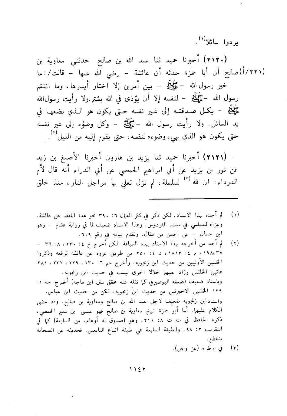 2121 - ثَنَا يَزِيدُ بْنُ هَارُونَ، أَخْبَرَنَا الْأَصْبَغُ بْنُ زَيْدٍ، عَنْ ثَوْرِ بْنِ يَزِيدَ، عَنْ أَبِي إِبْرَاهِيمَ الْحِمْصِيِّ، عَنْ أَبِي الدَّرْدَاءِ أَنَّهُ قَالَ لِأُمِّ الدَّرْدَاءِ: «§إِنَّ لِلَّهِ لَسِلْسِلَةً , لَمْ تَزَلْ تَغْلِي بِهَا مَرَاجِلُ النَّارِ مُنْذُ خَلَقَ -[1143]- اللَّهُ جَهَنَّمَ إِلَى يَوْمِ تُلْقَى فِي رِقَابِ النَّاسِ , قَدْ أَنْقَذَنَا اللَّهُ مِنْ نِصْفِهَا بِإِيمَانِنَا بِاللَّهِ الْعَظِيمِ، فَحُضِّي عَلَى طَعَامِ الْمِسْكِينِ يَا أُمَّ الدَّرْدَاءِ»
