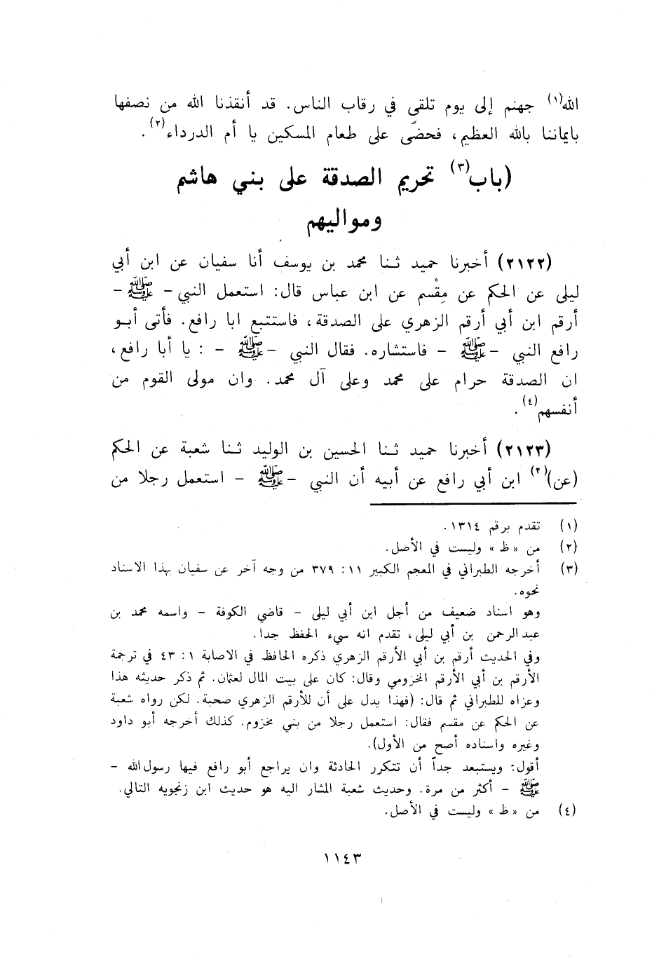 2123 - ثَنَا الْحُسَيْنُ بْنُ الْوَلِيدِ، ثَنَا شُعْبَةُ، عَنِ الْحَكَمِ، عَنِ ابْنِ أَبِي رَافِعٍ، عَنْ أَبِيهِ، أَنَّ النَّبِيَّ صَلَّى اللهُ عَلَيْهِ وَسَلَّمَ اسْتَعْمَلَ رَجُلًا مِنْ -[1144]- بَنِي مَخْزُومٍ عَلَى الصَّدَقَاتِ , فَقَالَ لِأَبِي رَافِعٍ: اصْحَبْنِي كَيْ أُنِيلَكَ مِنْهَا، قَالَ: فَقُلْتُ: حَتَّى أَسْأَلَ النَّبِيَّ صَلَّى اللهُ عَلَيْهِ وَسَلَّمَ، فَقَالَ النَّبِيُّ صَلَّى اللهُ عَلَيْهِ وَسَلَّمَ: «يَا أَبَا رَافِعٍ , أَوَمَا عَلِمْتَ أَنَّ §الصَّدَقَةَ لَا تَحِلُّ لِآلِ مُحَمَّدٍ» قَالَ: إِنَّمَا أَنَا مَوْلَاكَ , قَالَ: «مَوْلَى الْقَوْمِ مِنْ أَنْفُسِهِمْ»