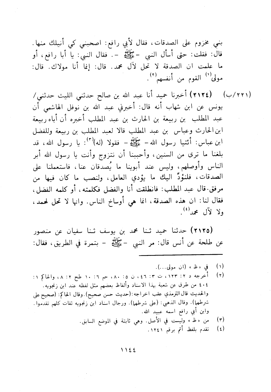 2124 - أَخْبَرَنَا حُمَيْدٌ أنا عَبْدُ اللَّهِ بْنُ صَالِحٍ، حَدَّثَنِي اللَّيْثُ، حَدَّثَنِي يُونُسُ، عَنِ ابْنِ شِهَابٍ أَنَّهُ قَالَ: أَخْبَرَنِي عَبْدُ اللَّهِ بْنُ نَوْفَلٍ الْهَاشِمِيُّ، أَنَّ عَبْدَ الْمُطَّلِبِ بْنَ رَبِيعَةَ بْنِ الْحَارِثِ بْنِ عَبْدِ الْمُطَّلِبِ، أَخْبَرَهُ، أَنَّ أَبَاهُ رَبِيعَةَ بْنَ الْحَارِثِ وَعَبَّاسَ بْنَ عَبْدِ الْمُطَّلِبِ قَالَا لِعَبْدِ الْمُطَّلِبِ بْنِ رَبِيعَةَ وَالْفَضْلِ بْنِ عَبَّاسٍ: ائْتِيَا رَسُولَ اللَّهِ صَلَّى اللهُ عَلَيْهِ وَسَلَّمَ فَقُولَا لَهُ: يَا رَسُولَ اللَّهِ , قَدْ بَلَغَنَا مَا تَرَى مِنَ السِّنِينَ , وَأَحْبَبْنَا نَتَزَوَّجُ , وَأَنْتَ يَا رَسُولَ اللَّهِ أَبَرُّ النَّاسِ وَأَوْصَلُهُمْ , وَلَيْسَ عِنْدَ أَبَوَيْنَا مَا يُصْدِقَانِ عَنَّا , فَاسْتَعْمِلْنَا عَلَى الصَّدَقَاتِ , فَلْنُؤَدِّ إِلَيْكَ مَا يُؤَدِّي الْعَامِلُ , وَلْنُصِبْ مَا كَانَ فِيهَا مِنْ مَرْفَقٍ , قَالَ عَبْدُ الْمُطَّلِبِ: فَانْطَلَقْتُ أَنَا وَالْفَضْلُ فَكَلَّمْتُهُ , أَوْ كَلَّمَهُ الْفَضْلُ , فَقَالَ لَنَا: «إِنَّ هَذِهِ §الصَّدَقَةَ إِنَّمَا هِيَ أَوْسَاخُ النَّاسِ , وَإِنَّهَا لَا تَحِلُّ لِمُحَمَّدٍ , وَلَا لِآلِ مُحَمَّدٍ»