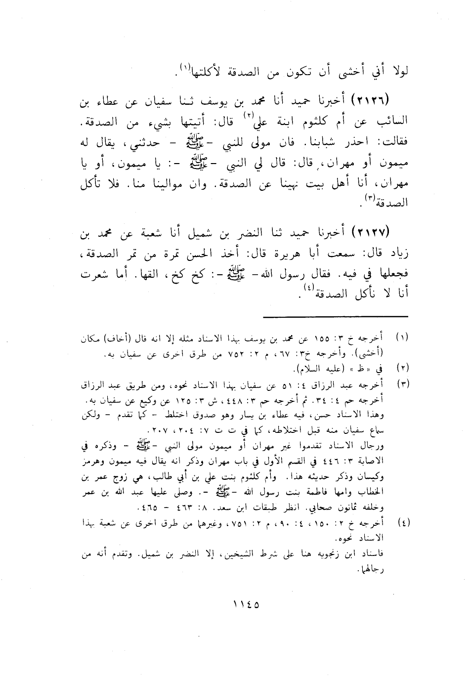 2126 - أَخْبَرَنَا حُمَيْدٌ أنا مُحَمَّدُ بْنُ يُوسُفَ، ثَنَا سُفْيَانُ، عَنْ عَطَاءِ بْنِ السَّائِبِ، عَنْ أُمِّ كُلْثُومِ ابْنَةِ عَلِيٍّ قَالَ: أَتَيْتُهَا بِشَيْءٍ مِنَ الصَّدَقَةِ , فَقَالَتِ: احْذَرْ شَبَابَنَا , فَإِنَّ مَوْلًى لِلنَّبِيِّ صَلَّى اللهُ عَلَيْهِ وَسَلَّمَ حَدَّثَنِي، يُقَالُ لَهُ مَيْمُونٌ أَوْ مِهْرَانُ قَالَ: قَالَ لِيَ النَّبِيُّ صَلَّى اللهُ عَلَيْهِ وَسَلَّمَ: «يَا مَيْمُونُ أَوْ يَا مِهْرَانُ , إِنَّا §أَهْلَ الْبَيْتِ نُهِينَا عَنِ الصَّدَقَةِ , وَإِنَّ مَوَالِيَنَا مِنَّا، فَلَا تَأْكُلِ الصَّدَقَةَ»
