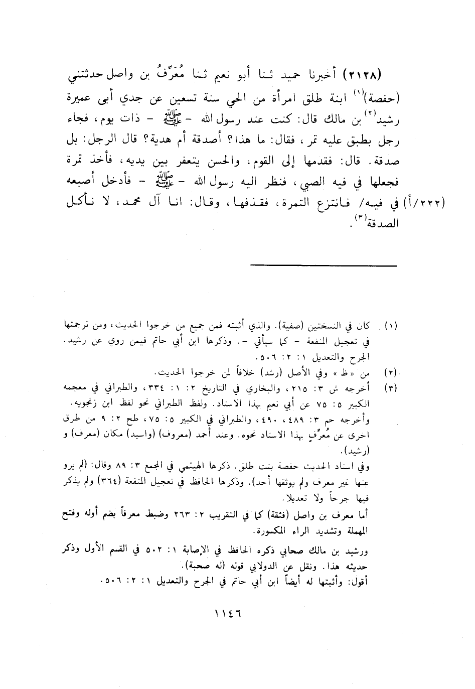 2128 - ثَنَا أَبُو نُعَيْمٍ، ثَنَا مُعَرِّفُ بْنُ وَاصِلٍ، حَدَّثَتْنِي حَفْصَةُ ابْنَةُ طَلْقٍ، امْرَأَةٌ مِنَ الْحَيِّ، سَنَةَ تِسْعِينَ، عَنْ جَدِّي أَبِي عَمِيرَةَ رُشَيْدِ بْنِ مَالِكٍ قَالَ: كُنْتُ عِنْدَ رَسُولِ اللَّهِ صَلَّى اللهُ عَلَيْهِ وَسَلَّمَ ذَاتَ يَوْمٍ، فَجَاءَ رَجُلٌ بِطَبَقٍ عَلَيْهِ تَمْرٌ، فَقَالَ: «مَا هَذَا؟ أَصَدَقَةٌ أَمْ هَدِيَّةٌ؟» قَالَ الرَّجُلُ: بَلْ صَدَقَةٌ , قَالَ: فَقَدِّمْهَا إِلَى الْقَوْمِ , وَالْحَسَنُ يَتَعَفَّرُ بَيْنَ يَدَيْهِ , فَأَخَذَ تَمْرَةً فَجَعَلَهَا فِي فِيهِ، فَنَظَرَ إِلَيْهِ رَسُولُ اللَّهِ صَلَّى اللهُ عَلَيْهِ وَسَلَّمَ فَأَدْخَلَ إِصْبَعَهُ فِي فِيهِ الصَّبِيُّ، فَانْتَزَعَ التَّمْرَةَ , فَقَذَفَهَا وَقَالَ: «§إِنَّا آلَ مُحَمَّدٍ لَا نَأْكُلُ الصَّدَقَةَ»