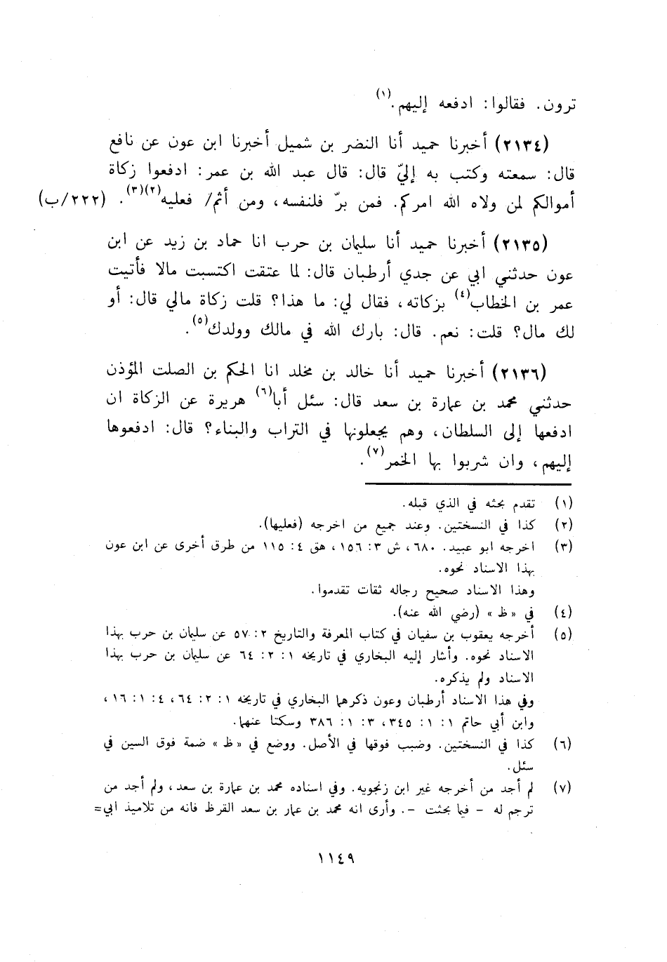 2134 - أَخْبَرَنَا حُمَيْدٌ أنا النَّضْرُ بْنُ شُمَيْلٍ، أَخْبَرَنَا ابْنُ عَوْنٍ، عَنْ نَافِعٍ قَالَ: سَمِعْتُهُ وَكَتَبَ بِهِ إِلَيَّ قَالَ: قَالَ عَبْدُ اللَّهِ بْنُ عُمَرَ: «§ادْفَعُوا زَكَاةَ أَمْوَالِكُمْ لِمَنْ وَلَّاهُ اللَّهُ أَمْرَكُمْ , فَمَنْ بَرَّ فَلِنَفْسِهِ , وَمَنْ أَثِمَ فَعَلَيْهِ»