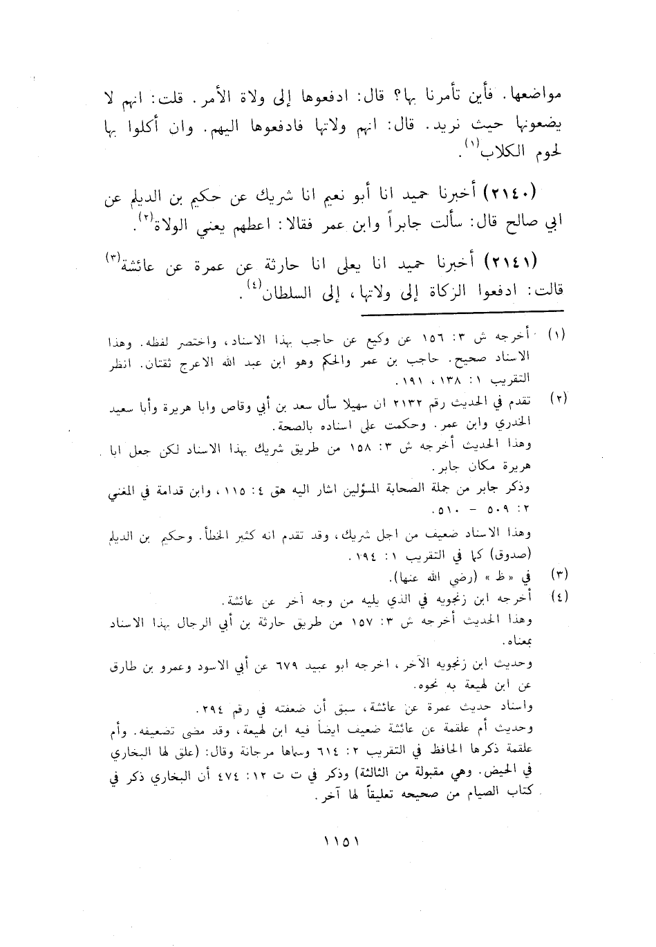 2141 - أَخْبَرَنَا حُمَيْدٌ أنا يَعْلَى، أنا حَارِثَةُ، عَنْ عَمْرَةَ، عَنْ عَائِشَةَ قَالَتْ: «§ادْفَعُوا الزَّكَاةَ إِلَى وُلَاتِهَا , إِلَى السُّلْطَانِ»