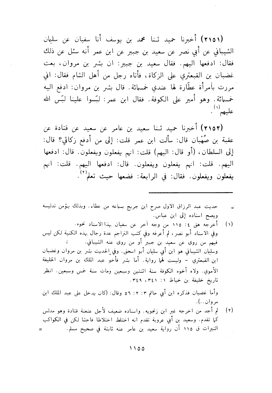 2151 - ثَنَا مُحَمَّدُ بْنُ يُوسُفَ، أنا سُفْيَانُ، عَنْ سُلَيْمَانَ الشَّيْبَانِيِّ، عَنْ أَبِي نَصْرٍ، عَنْ سَعِيدِ بْنِ جُبَيْرٍ، عَنِ ابْنِ عُمَرَ، أَنَّهُ سُئِلَ عَنْ ذَلِكَ فَقَالَ: «§ادْفَعْهَا إِلَيْهِمْ» ، فَقَالَ سَعِيدُ بْنُ جُبَيْرٍ: إِنَّ بِشْرَ بْنَ مَرْوَانَ بَعَثَ غَضْبَانَ بْنَ الْقَبَعْثَرِيِّ عَلَى الزَّكَاةِ، فَأَتَاهُ رَجُلٌ مِنْ أَهْلِ الشَّامِ فَقَالَ: إِنِّي مَرَرْتُ بِامْرَأَةٍ عَطَّارَةٍ لَهَا عِنْدِي خَمْسُمِائَةٍ، قَالَ بِشْرُ بْنُ مَرْوَانَ: ادْفَعْ إِلَيْهِ خَمْسَمِائَةٍ، وَهُوَ أَمِيرٌ عَلَى الْكُوفَةِ، فَقَالَ ابْنُ عُمَرَ: «لَبَّسُوا عَلَيْنَا لَبَّسَ اللَّهُ عَلَيْهِمْ»