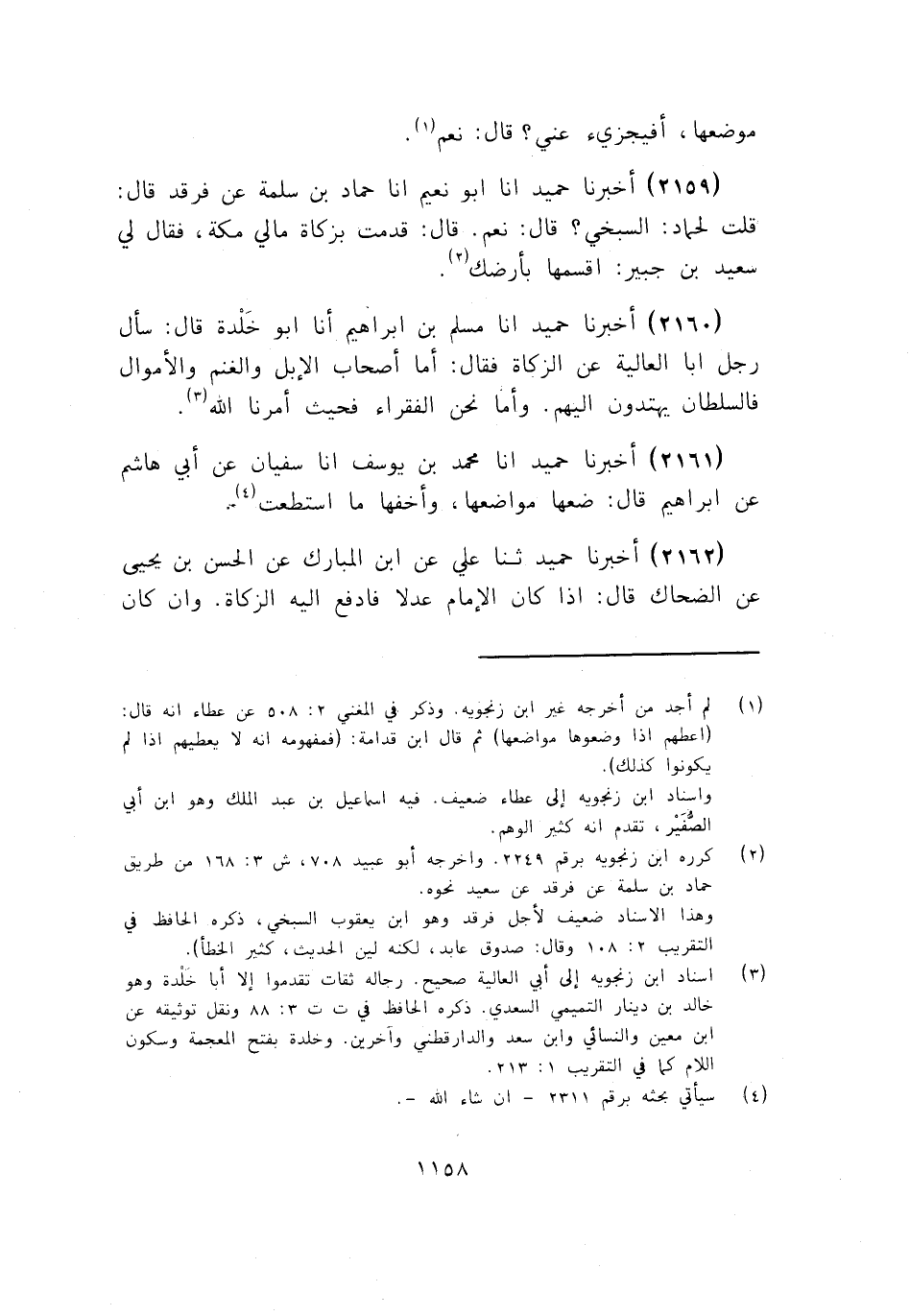 2159 - أَخْبَرَنَا حُمَيْدٌ أنا أَبُو نُعَيْمٍ، أنا حَمَّادُ بْنُ سَلَمَةَ، عَنْ فَرْقَدٍ قَالَ: قُلْتُ لِحَمَّادٍ، السَّبَخِيِّ؟ قَالَ: نَعَمْ، قَالَ: قَدِمْتُ بِزَكَاةِ مَالِي مَكَّةَ , فَقَالَ لِي سَعِيدُ بْنُ جُبَيْرٍ: «§اقْسِمْهَا بِأَرْضِكَ»