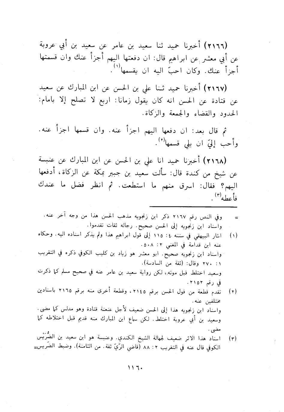 2167 - ثَنَا عَلِيُّ بْنُ الْحَسَنِ، عَنِ ابْنِ الْمُبَارَكِ، عَنْ سَعِيدٍ، عَنْ قَتَادَةَ، عَنِ الْحَسَنِ، أَنَّهُ كَانَ يَقُولُ زَمَانًا: " §أَرْبَعٌ لَا تَصْلُحُ إِلَّا بِإِمَامٍ: الْحُدُودُ، وَالْقَضَاءُ، وَالْجُمُعَةُ، وَالزَّكَاةُ. ثُمَّ قَالَ بَعْدُ: إِنْ دَفَعَهَا إِلَيْهِمْ أَجْزَأَ عَنْهُ، وَإِنْ قَسَمَهَا أَجْزَأَ عَنْهُ، وَأَحَبُّ إِلَيَّ أَنْ يَلِيَ قَسْمَهَا