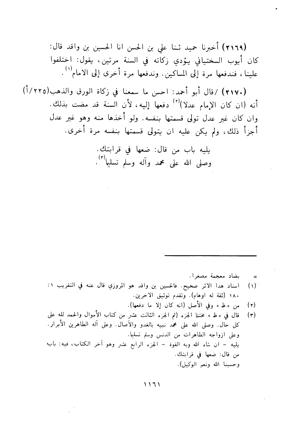 2169 - أَخْبَرَنَا حُمَيْدٌ أنا عَلِيُّ بْنُ الْحَسَنِ، أنا الْحُسَيْنُ بْنُ وَاقِدٍ قَالَ: كَانَ أَيُّوبُ السَّخْتِيَانِيُّ §يُؤَدِّي زَكَاتَهُ فِي السَّنَةِ مَرَّتَيْنِ، يَقُولُ: اخْتَلَفُوا عَلَيْنَا فَنَدْفَعُهَا مَرَّةً إِلَى الْمَسَاكِينِ، وَنَدْفَعُهَا مَرَّةً أُخْرَى إِلَى الْإِمَامِ "