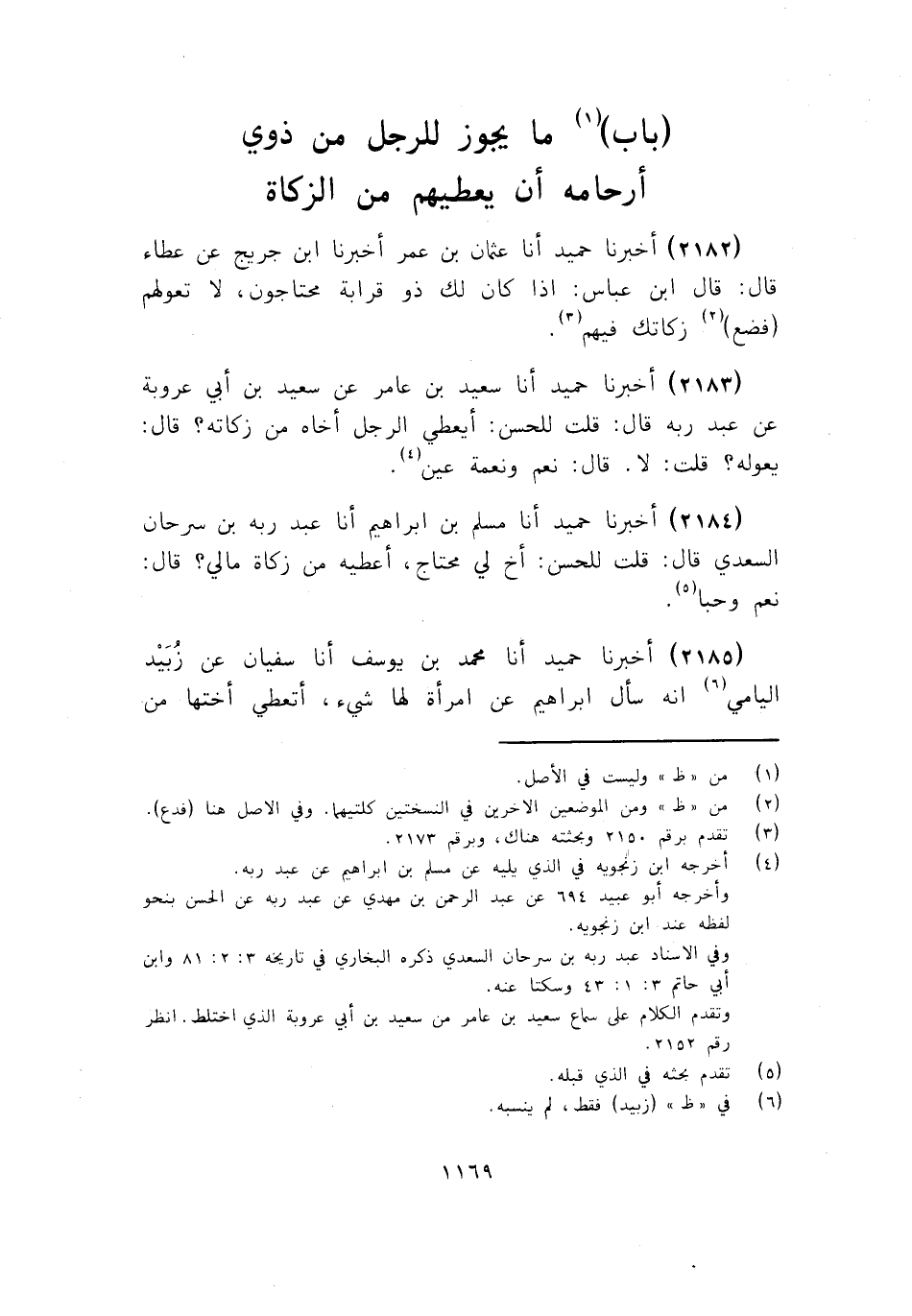 2182 - أَخْبَرَنَا حُمَيْدٌ أنا عُثْمَانُ بْنُ عُمَرَ، أَخْبَرَنَا ابْنُ جُرَيْجٍ، عَنْ عَطَاءٍ قَالَ: قَالَ ابْنُ عَبَّاسٍ: «§إِذَا كَانَ لَكَ ذُو قَرَابَةٍ مُحْتَاجُونَ، لَا تَعُولُهُمْ فَضَعْ زَكَاتَكَ فِيهِمْ»
