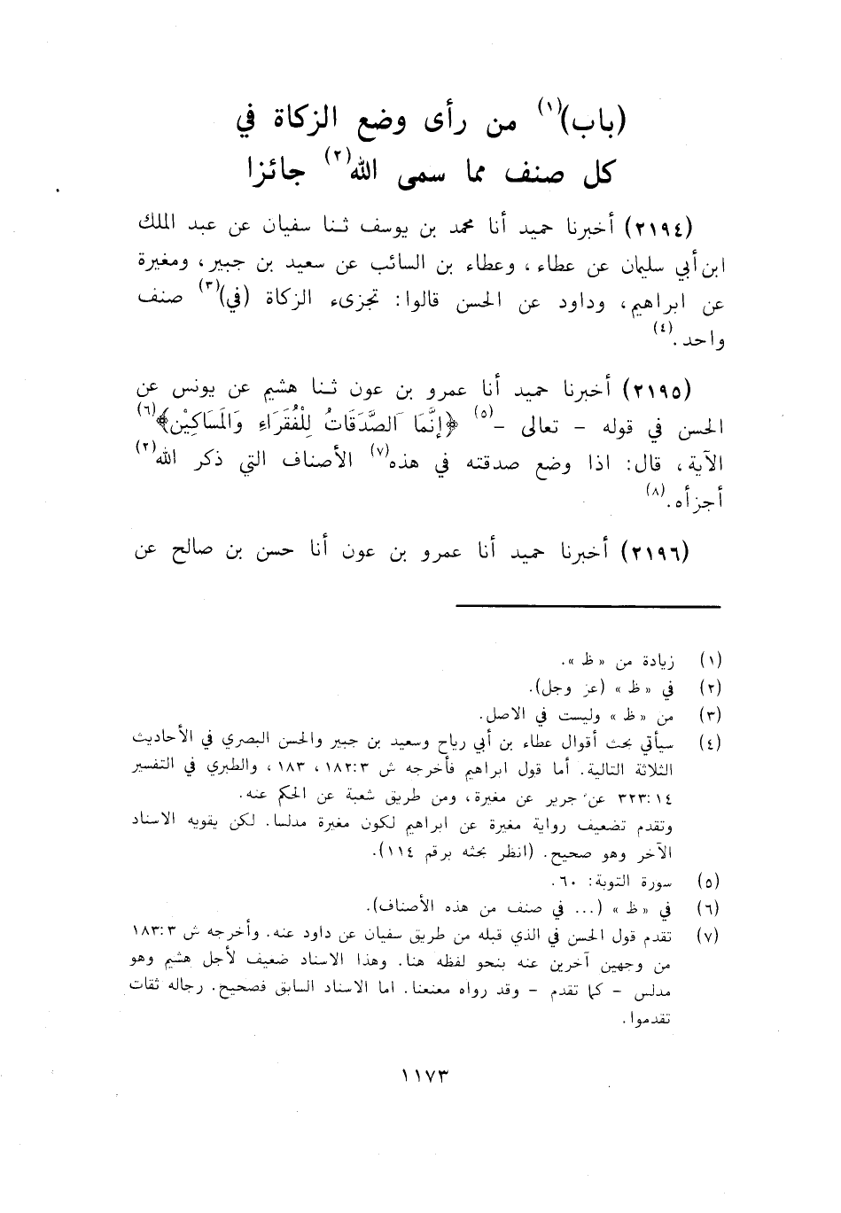 2194 - أَخْبَرَنَا حُمَيْدٌ أنا مُحَمَّدُ بْنُ يُوسُفَ، ثَنَا سُفْيَانُ، عَنْ عَبْدِ الْمَلِكِ بْنِ أَبِي سُلَيْمَانَ، عَنْ عَطَاءٍ، وَعَطَاءُ بْنُ السَّائِبِ، عَنْ سَعِيدِ بْنِ جُبَيْرٍ، وَمُغِيرَةُ، عَنْ إِبْرَاهِيمَ، وَدَاوُدُ، عَنِ الْحَسَنِ قَالُوا: «§تُجْزِئُ الزَّكَاةُ فِي صِنْفٍ وَاحِدٍ»
