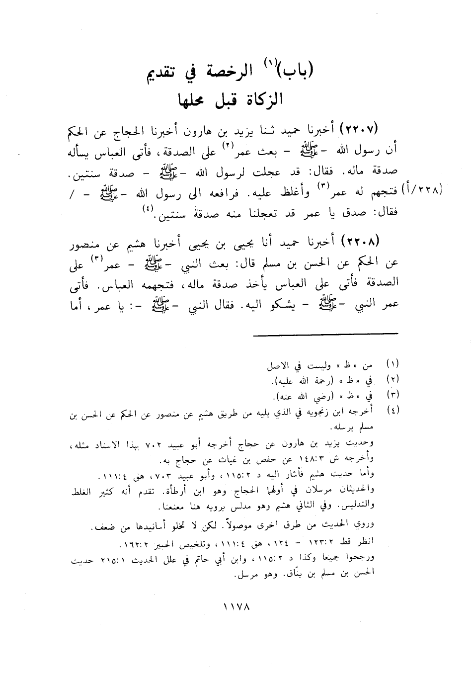2207 - ثَنَا يَزِيدُ بْنُ هَارُونَ، أَخْبَرَنَا الْحَجَّاجُ، عَنِ الْحَكَمِ، أَنَّ رَسُولَ اللَّهِ صَلَّى اللهُ عَلَيْهِ وَسَلَّمَ بَعَثَ عُمَرَ عَلَى الصَّدَقَةِ، فَأَتَى الْعَبَّاسَ يَسْأَلُهُ صَدَقَةَ مَالِهِ، فَقَالَ: قَدْ عَجَّلْتُ لِرَسُولِ اللَّهِ صَلَّى اللهُ عَلَيْهِ وَسَلَّمَ صَدَقَةَ سَنَتَيْنِ، فَتَجَهَّمَ لَهُ عُمَرُ وَأَغْلَظَ عَلَيْهِ، فَرَافَعَهُ إِلَى رَسُولِ اللَّهِ صَلَّى اللهُ عَلَيْهِ وَسَلَّمَ فَقَالَ: «صَدَقَ يَا عُمَرُ، قَدْ §تَعَجَّلْنَا مِنْهُ صَدَقَةَ سَنَتَيْنِ»