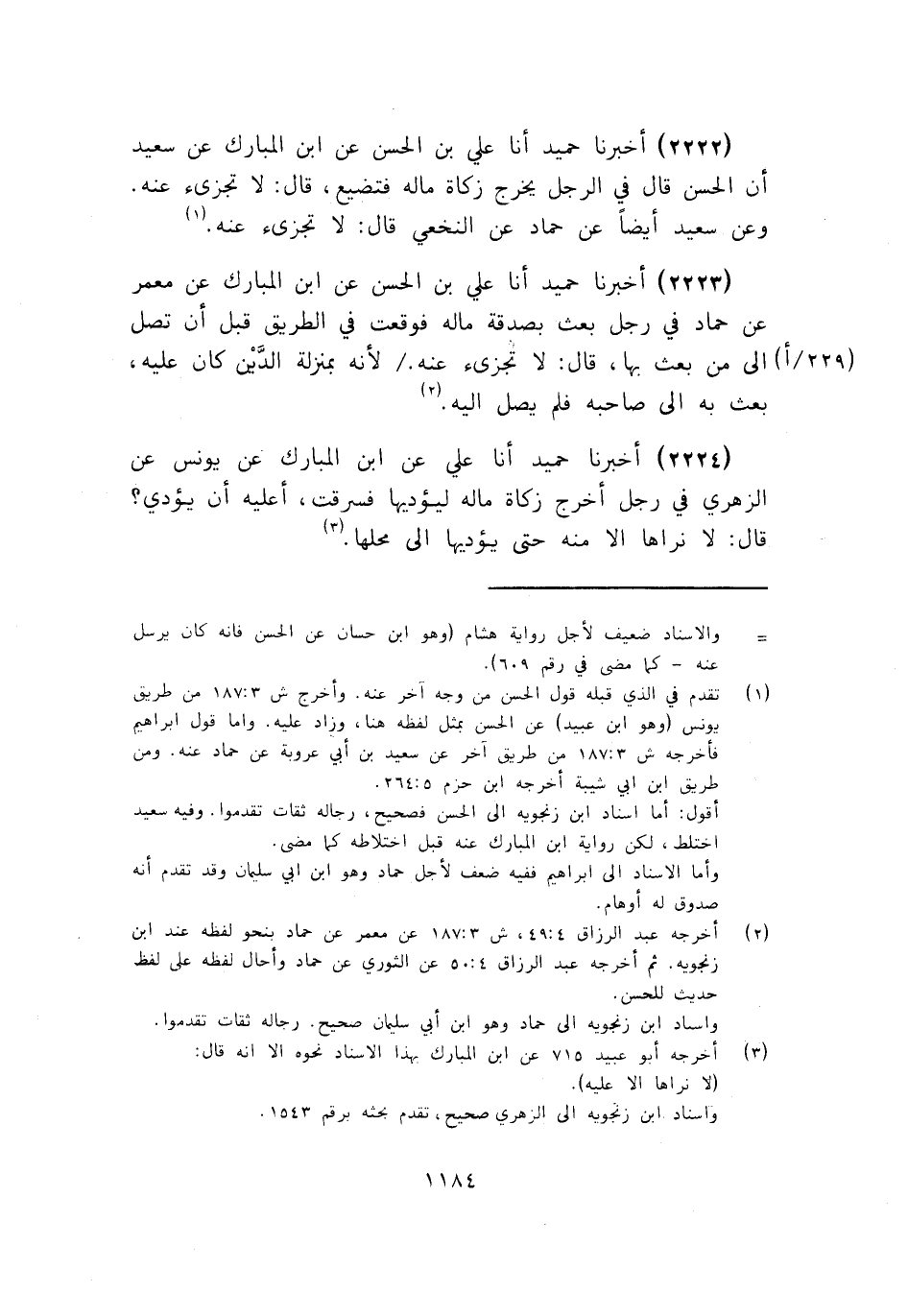 2222 - أَخْبَرَنَا حُمَيْدٌ أنا عَلِيُّ بْنُ الْحَسَنِ، عَنِ ابْنِ الْمُبَارَكِ، عَنْ سَعِيدٍ، أَنَّ الْحَسَنَ قَالَ: " فِي §الرَّجُلِ يُخْرِجُ زَكَاةَ مَالِهِ فَتَضِيعُ، قَالَ: لَا تُجْزِيءُ عَنْهُ " وَعَنْ سَعِيدٍ أَيْضًا، عَنْ حَمَّادٍ، عَنِ النَّخَعِيِّ قَالَ: لَا تُجْزِيءُ عَنْهُ