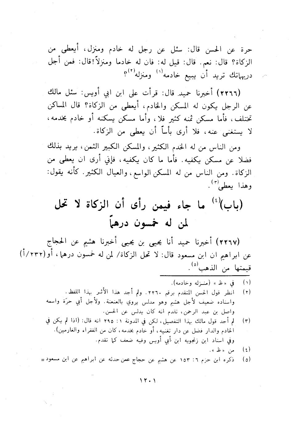 2266 - قَرَأَتُ عَلَى ابْنِ أَبِي أُوَيْسٍ: سُئِلَ مَالِكٌ عَنِ الرَّجُلِ، يَكُونُ لَهُ الْمَسْكَنُ وَالْخَادِمُ، أَيُعْطَى مِنَ الزَّكَاةِ؟ قَالَ: " §الْمَسَاكِنُ تَخْتَلِفُ، فَأَمَّا مَسْكَنٌ ثَمَنُهُ كَثِيرٌ فَلَا، وَأَمَّا مَسْكَنٌ يَسْكُنُهُ أَوْ خَادِمٌ يَخْدُمُهُ لَا يُسْتَغْنَى عَنْهُ، فَلَا أَرَى بَأْسًا أَنْ يُعْطَى مِنَ الزَّكَاةِ وَمِنَ النَّاسِ مَنْ لَهُ الْخَدَمُ الْكَثِيرُ، وَالْمَسْكَنُ الْكَبِيرُ الثَّمَنِ، يُرِيدُ بِذَلِكَ فَضْلًا عَنْ مَسْكَنٍ يَكْفِيهِ، فَأَمَّا مَا كَانَ يَكْفِيهِ فَإِنِّي أَرَى أَنْ يُعْطَى مِنَ الزَّكَاةِ، وَمِنَ النَّاسِ مَنْ لَهُ الْمَسْكَنُ الْوَاسِعُ، وَالْعِيَالُ الْكَثِيرُ، كَأَنَّهُ يَقُولُ: وَهَذَا يُعْطَى