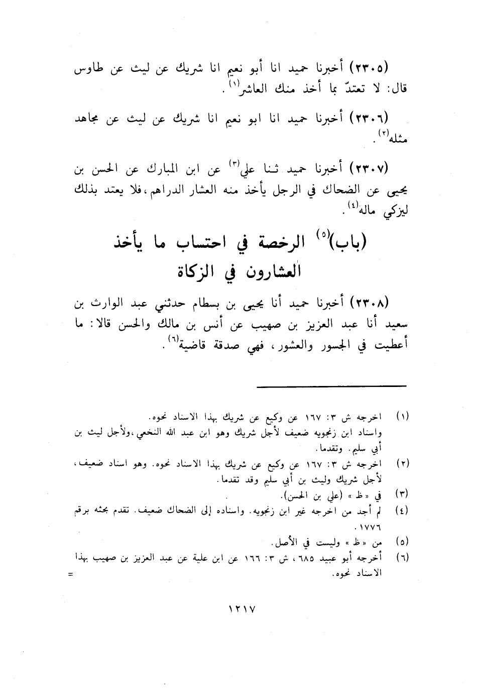 2305 - أَخْبَرَنَا حُمَيْدٌ أنا أَبُو نُعَيْمٍ، أنا شَرِيكٌ، عَنْ لَيْثٍ، عَنْ طَاوُسٍ قَالَ: «§لَا تَعْتَدَّ بِمَا أَخَذَ مِنْكَ الْعَاشِرُ» .