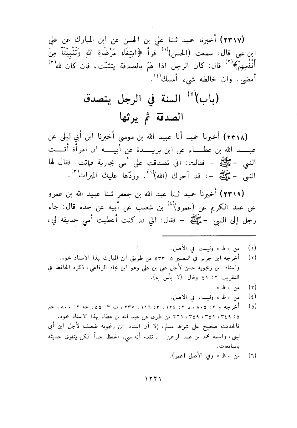 2317 - ثَنَا عَلِيُّ بْنُ الْحَسَنِ، عَنِ ابْنِ الْمُبَارَكِ، عَنْ عَلِيِّ بْنِ عَلِيٍّ قَالَ: سَمِعْتُ الْحَسَنَ قَرَأَ: {§ابْتِغَاءَ مَرْضَاةِ اللَّهِ وَتَثْبِيتًا مِنْ أَنْفُسِهِمْ} قَالَ: «كَانَ الرَّجُلُ إِذَا هَمَّ بِالصَّدَقَةِ يَتَثَبَّتُ، فَإِنْ كَانَ لِلَّهِ أَمْضَى، وَإِنْ خَالَطَهُ شَيْءٌ أَمْسَكَ»