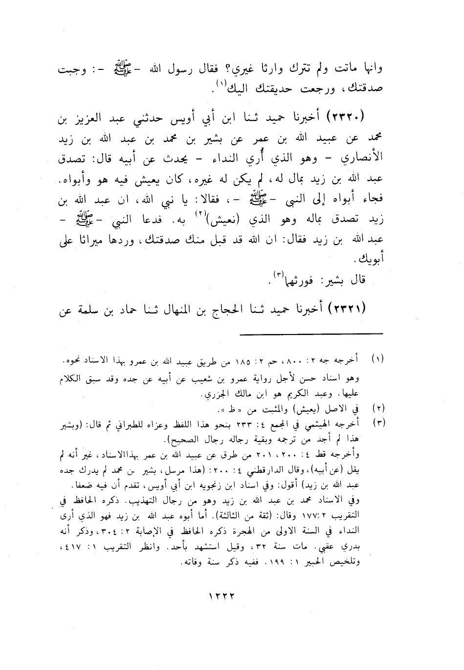 2320 - ثَنَا ابْنُ أَبِي أُوَيْسٍ، حَدَّثَنِي عَبْدُ الْعَزِيزِ بْنُ مُحَمَّدٍ، عَنْ عُبَيْدِ اللَّهِ بْنِ عُمَرَ، عَنْ بَشِيرِ بْنِ مُحَمَّدِ بْنِ عَبْدِ اللَّهِ بْنِ زَيْدٍ الْأَنْصَارِيِّ وَهُوَ الَّذِي أُرِيَ النِّدَاءَ يُحَدِّثُ عَنْ أَبِيهِ قَالَ: تَصَدَّقَ عَبْدُ اللَّهِ بْنُ زَيْدٍ بِمَالٍ لَهُ، لَمْ يَكُنْ لَهُ غَيْرُهُ، كَانَ يَعِيشُ فِيهِ هُوَ وَأَبَوَاهُ، فَجَاءَ أَبَوَاهُ إِلَى النَّبِيِّ صَلَّى اللهُ عَلَيْهِ وَسَلَّمَ فَقَالَا: يَا نَبِيَّ اللَّهِ، إِنَّ عَبْدَ اللَّهِ بْنَ زَيْدٍ تَصَدَّقَ بِمَالِهِ وَهُوَ الَّذِي نَعِيشُ بِهِ، فَدَعَا النَّبِيُّ صَلَّى اللهُ عَلَيْهِ وَسَلَّمَ عَبْدَ اللَّهِ بْنَ زَيْدٍ فَقَالَ: «§إِنَّ اللَّهَ قَدْ قَبِلَ مِنْكَ صَدَقَتَكَ، وَرُدَّهَا مِيرَاثًا عَلَى أَبَوَيْكَ» قَالَ بَشِيرٌ: فَوَرِثَهُمَا