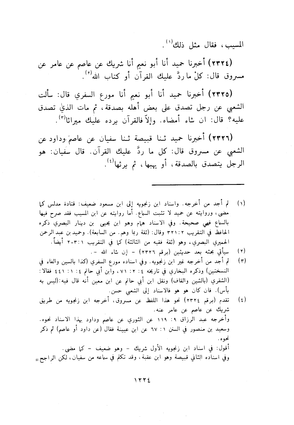 2325 - أَخْبَرَنَا حُمَيْدٌ أنا أَبُو نُعَيْمٍ، أنا مُوَرِّعٌ السَفَرِيُّ، قَالَ: سَأَلْتُ الشَّعْبِيَّ عَنْ رَجُلٍ، تَصَدَّقَ عَلَى بَعْضِ أَهْلِهِ بِصَدَقَةٍ، ثُمَّ مَاتَ الَّذِي تَصَدَّقَ عَلَيْهِ؟ قَالَ: «§إِنْ شَاءَ أَمْضَاهُ، وَإِلَّا فَالْقُرْآنُ يَرُدَّهُ عَلَيْكَ مِيرَاثًا»