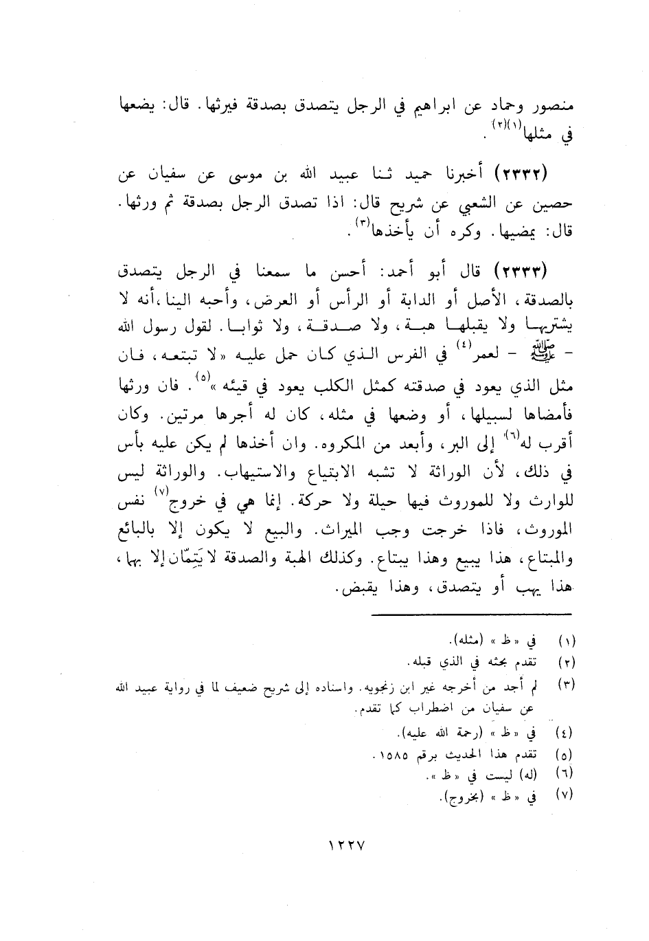 2333 - قَالَ أَبُو أَحْمَدَ: أَحْسَنُ مَا سَمِعْنَا فِي الرَّجُلِ، يَتَصَدَّقُ بِالصَّدَقَةِ الْأَصْلِ أَوِ الدَّابَّةِ أَوِ الرَّأْسِ أَوِ الْعَرْضِ، وَأَحَبُّهُ إِلَيْنَا، أَنَّهُ لَا يَشْتَرِيهَا وَلَا يَقْبَلُهَا هِبَةً، وَلَا صَدَقَةَ، وَلَا ثَوَابًا، لِقَوْلِ رَسُولِ اللَّهِ صَلَّى اللهُ عَلَيْهِ وَسَلَّمَ لِعُمَرَ فِي الْفَرَسِ الَّذِي كَانَ حَمَلَ عَلَيْهِ: «لَا تَبْتَعْهُ، فَإِنَّ مَثَلَ الَّذِي يَعُودُ فِي صَدَقَتِهِ كَمَثَلِ الْكَلْبِ يَعُودُ فِي قَيْئِهِ» ، فَإِنْ وَرِثَهَا فَأَمْضَاهَا لِسَبِيلِهَا أَوْ وَضَعَهَا فِي مِثْلِهِ، كَانَ لَهُ أَجْرُهَا مَرَّتَيْنِ، وَكَانَ أَقْرَبَ لَهُ إِلَى الْبِرِّ، وَأَبْعَدَ مِنَ الْمَكْرُوهِ، وَإِنْ أَخَذَهَا لَمْ يَكُنْ عَلَيْهِ بَأْسٌ فِي ذَلِكَ، لِأَنَّ الْوِرَاثَةَ لَا تُشْبِهُ الِابْتِيَاعَ وَالِاسْتِيهَابَ وَالْوِرَاثَةُ لَيْسَ لِلْوَارِثِ وَلَا لِلْمَوْرُوثِ فِيهَا حِيلَةٌ وَلَا حَرَكَةٌ، إِنَّمَا هِيَ فِي خُرُوجِ نَفْسِ الْمَوْرُوثِ، فَإِذَا خَرَجَتْ وَجَبَ الْمِيرَاثُ، وَالْبَيْعُ لَا يَكُونُ إِلَّا بِالْبَائِعِ وَالْمُبْتَاعِ، هَذَا يَبِيعُ وَهَذَا يَبْتَاعُ، وَكَذَلِكَ الْهِبَةُ وَالصَّدَقَةُ لَا يَتِمَّانِ إِلَّا بِهِمَا، هَذَا يَهَبُ أَوْ يَتَصَدَّقُ وَهَذَا يَقْبِضُ -[1228]- وَقَدْ فَرَّقَ النَّبِيُّ صَلَّى اللهُ عَلَيْهِ وَسَلَّمَ بَيْنَ الْوِرَاثَةِ وَالِابْتِيَاعِ، فَقَالَ فِي الِابْتِيَاعِ: «لَا تَبْتَعْهُ» ، وَقَالَ فِي الْوِرَاثَةِ: «آجَرَكَ اللَّهُ، وَرَدَّ عَلَيْكَ الْمِيرَاثَ»