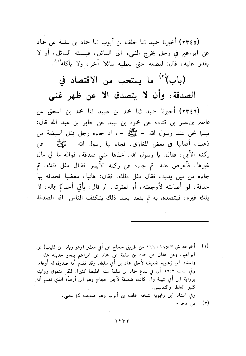 2346 - ثَنَا مُحَمَّدُ بْنُ عُبَيْدٍ، ثَنَا مُحَمَّدُ بْنُ إِسْحَاقَ، عَنْ عَاصِمِ بْنِ عُمَرَ بْنِ قَتَادَةَ، عَنْ مَحْمُودِ بْنِ لَبِيدٍ، عَنْ جَابِرِ بْنِ عَبْدِ اللَّهِ قَالَ: بَيْنَمَا نَحْنُ عِنْدَ رَسُولِ اللَّهِ صَلَّى اللهُ عَلَيْهِ وَسَلَّمَ، إِذْ جَاءَهُ رَجُلٌ بِمِثْلِ الْبَيْضَةِ مِنْ ذَهَبٍ، أَصَابَهَا فِي بَعْضِ الْمَغَازِي، فَجَاءَ بِهَا رَسُولَ اللَّهِ صَلَّى اللهُ عَلَيْهِ وَسَلَّمَ عَنْ رُكْنِهِ الْأَيْمَنَ، فَقَالَ: يَا رَسُولَ اللَّهِ، خُذْهَا مِنِّي صَدَقَةً، فَوَاللَّهِ مَا لِي مَالٌ غَيْرُهَا، فَأَعْرَضَ عَنْهُ، ثُمَّ جَاءَهُ عَنْ رُكْنِهِ الْأَيْسَرِ فَقَالَ مِثْلَ ذَلِكَ، ثُمَّ جَاءَهُ مِنْ بَيْنِ يَدَيْهِ فَقَالَ مِثْلَ ذَلِكَ، فَقَالَ: «هَاتِهَا» مُغْضَبًا، فَحَذَفَهُ بِهَا حَذْفَةً لَوْ أَصَابَتْهُ لَأَوْجَعَتْهُ، أَوْ لَعَقَرَتْهُ، ثُمَّ قَالَ: «يَأْتِي أَحَدُكُمْ بِمَالِهِ، لَا يَمْلِكُ غَيْرَهُ، فَيُتَصَدَّقُ بِهِ، ثُمَّ يَقْعُدُ بَعْدَ ذَلِكَ يَتَكَفَّفُ النَّاسَ، §إِنَّمَا الصَّدَقَةُ -[1233]- عَنْ ظَهْرِ غِنًى، خُذِ الَّذِي لَكَ، فَلَا حَاجَةَ لَنَا بِهِ» ، فَأَخَذَ الرَّجُلُ مَالَهُ وَذَهَبَ