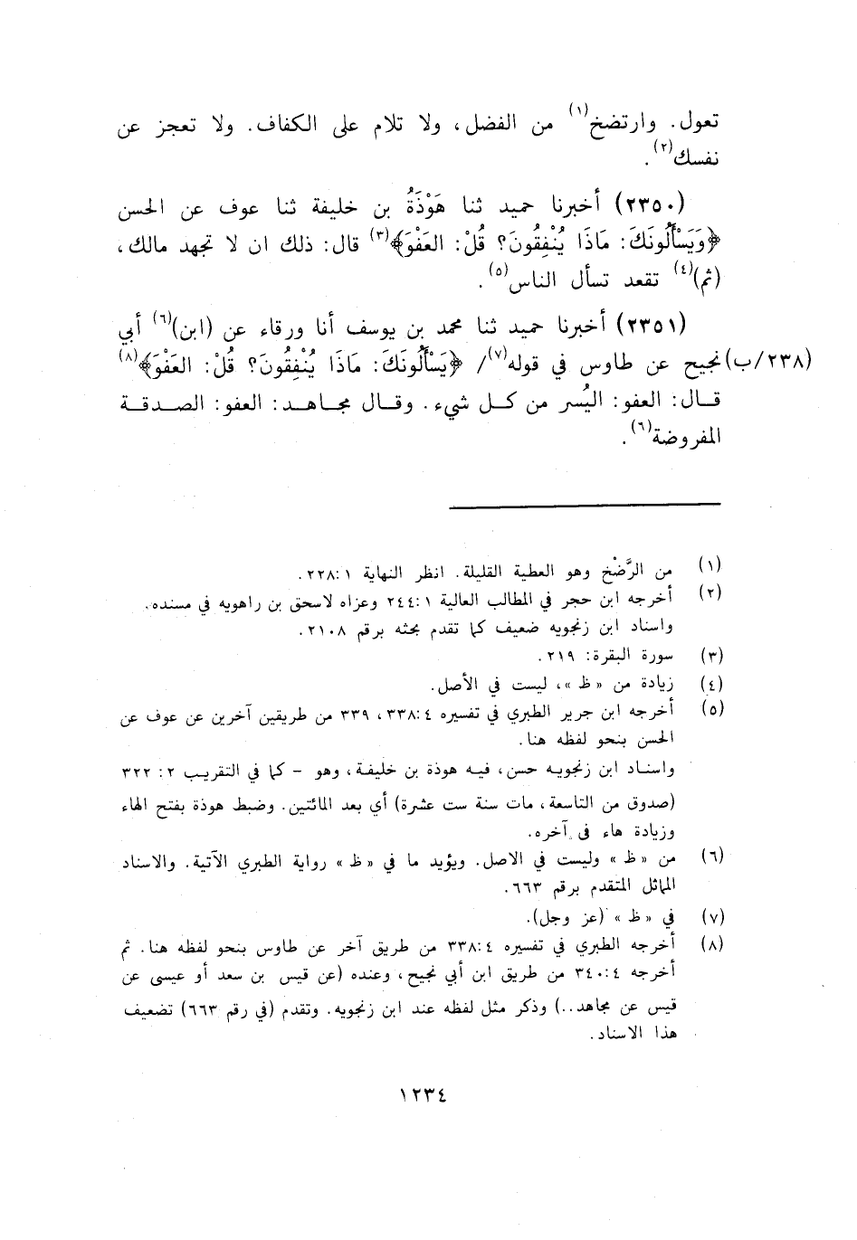 2350 - ثَنَا هَوْذَةُ بْنُ خَلِيفَةَ، ثَنَا عَوْفٌ، عَنِ الْحَسَنِ: {§وَيَسْأَلُونَكَ مَاذَا يُنْفِقُونَ قُلِ الْعَفْوَ} [البقرة: 219] ، قَالَ: «ذَلِكَ أَنْ لَا تَجْهَدَ مَالَكَ، ثُمَّ تَقْعُدَ تَسْأَلُ النَّاسَ»