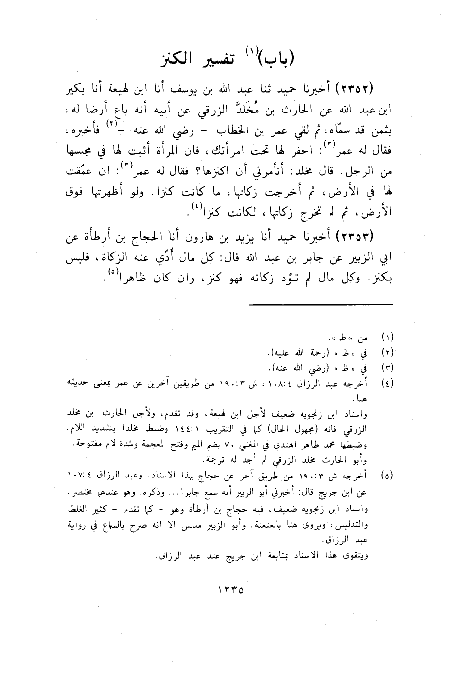 2353 - أَخْبَرَنَا حُمَيْدٌ أنا يَزِيدُ بْنُ هَارُونَ، أنا الْحَجَّاجُ بْنُ أَرْطَاةَ، عَنْ أَبِي الزُّبَيْرِ، عَنْ جَابِرِ بْنِ عَبْدِ اللَّهِ قَالَ: «§كُلُّ مَالٍ أُدِّيَ عَنْهُ الزَّكَاةُ، فَلَيْسَ بِكَنْزٍ، وَكُلُّ مَالٍ لَمْ تُؤَدَّ زَكَاتُهُ فَهُوَ كَنْزٌ، وَإِنْ كَانَ ظَاهِرًا»
