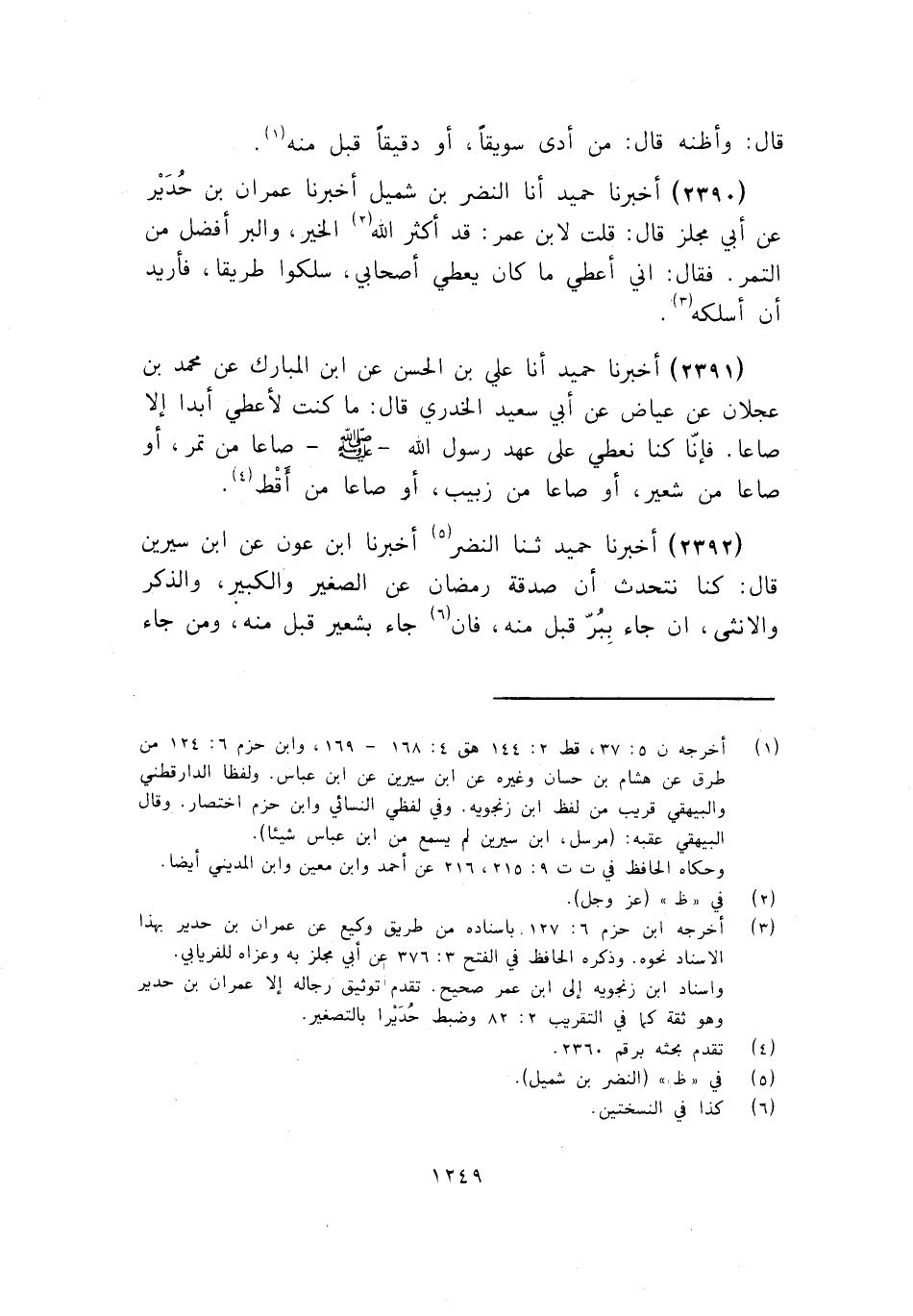 2392 - ثَنَا النَّضْرُ، أَخْبَرَنَا ابْنُ عَوْنٍ، عَنِ ابْنِ سِيرِينَ قَالَ: كُنَّا نَتَحَدَّثُ: " أَنَّ §صَدَقَةَ رَمَضَانَ: عَنِ الصَّغِيرِ وَالْكَبِيرِ، وَالذَّكَرِ وَالْأُنْثَى، إِنْ جَاءَ بِبُرٍّ قُبِلَ مِنْهُ، فَإِنْ جَاءَ بِشَعِيرٍ قُبِلَ مِنْهُ، وَمَنْ جَاءَ -[1250]- بِتَمْرٍ قُبِلَ مِنْهُ، وَمَنْ جَاءَ بِزَبِيبٍ قُبِلَ مِنْهُ، وَمَنْ جَاءَ بِسُلْتٍ قُبِلَ مِنْهُ، وَأَظُنُّهُ قَالَ: وَمَنْ جَاءَ بِدَقِيقٍ قُبِلَ مِنْهُ، وَمَنْ جَاءَ بِسَوِيقٍ قُبِلَ مِنْهُ