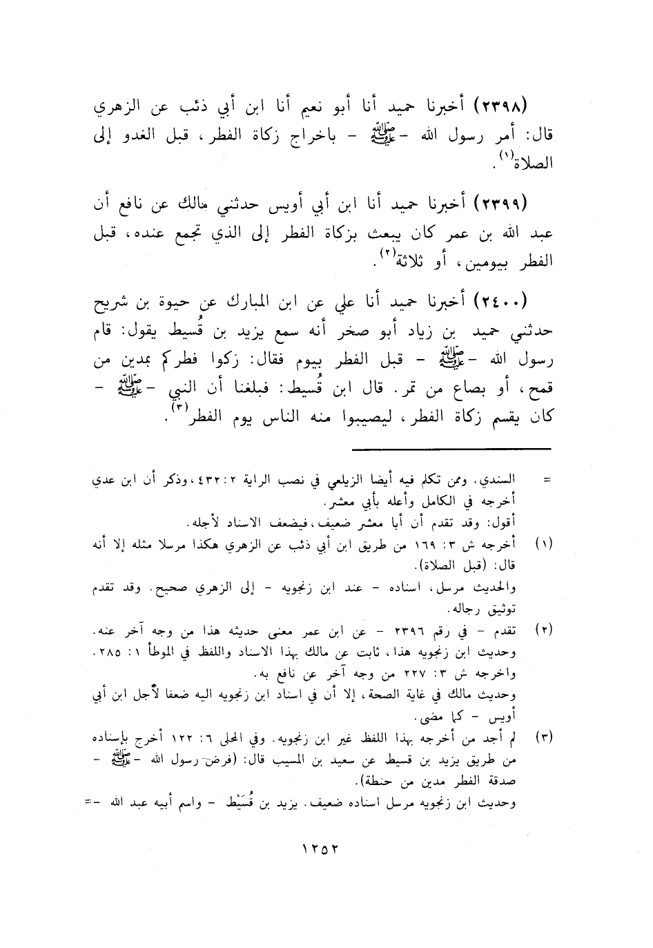 2398 - أَخْبَرَنَا حُمَيْدٌ أنا أَبُو نُعَيْمٍ، أنا ابْنُ أَبِي ذِئْبٍ، عَنِ الزُّهْرِيِّ قَالَ: " §أَمَرَ رَسُولُ اللَّهِ صَلَّى اللهُ عَلَيْهِ وَسَلَّمَ بِإِخْرَاجِ زَكَاةِ الْفِطْرِ قَبْلَ الْغُدُوِّ إِلَى الصَّلَاةِ