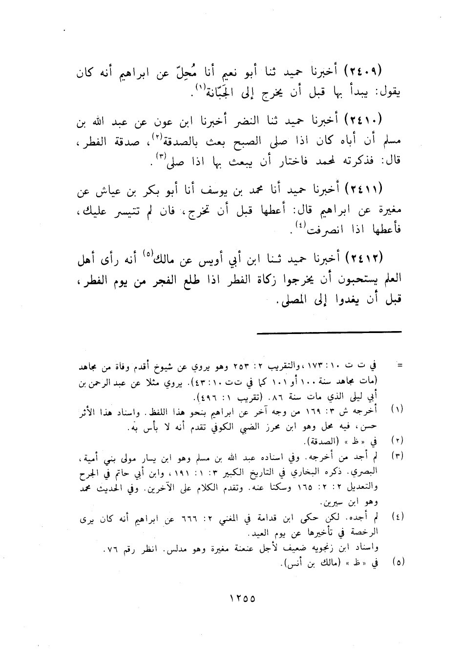 2410 - ثَنَا النَّضْرُ، أَخْبَرَنَا ابْنُ عَوْنٍ، عَنْ عَبْدِ اللَّهِ بْنِ مُسْلِمٍ، أَنَّ أَبَاهُ: " كَانَ §إِذَا صَلَّى الصُّبْحَ بَعَثَ بِالصَّدَقَةِ، صَدَقَةَ الْفِطْرِ، قَالَ: فَذَكَرْتُهُ لِمُحَمَّدٍ، فَاخْتَارَ أَنْ يَبْعَثَ بِهَا إِذَا صَلَّى "