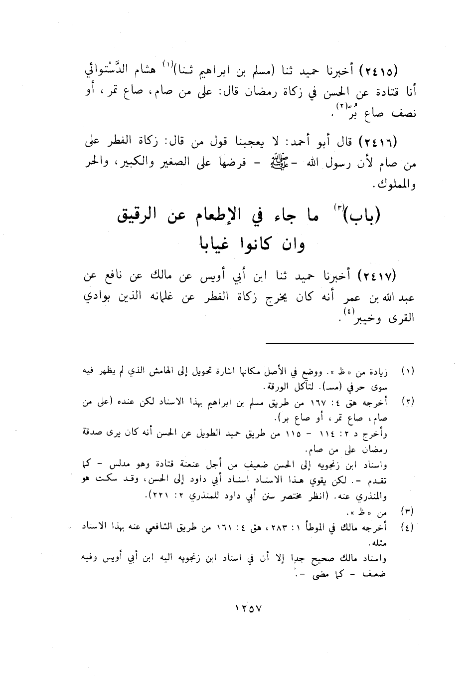 2417 - ثَنَا ابْنُ أَبِي أُوَيْسٍ، عَنْ مَالِكٍ، عَنْ نَافِعٍ، عَنْ عَبْدِ اللَّهِ بْنِ عُمَرَ: " أَنَّهُ كَانَ §يُخْرِجُ زَكَاةَ الْفِطْرِ عَنْ غِلْمَانِهِ الَّذِينَ بِوَادِي الْقُرَى وَخَيْبَرَ